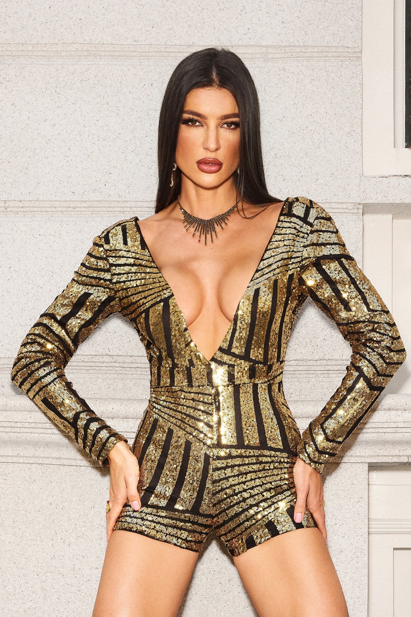 V Yaka Uzun Kollu Payetli Mini Tulum, zarif tasarımıyla her davette göz kamaştırır. Özel üretimi ve dikkat çekici detaylarıyla öne çıkan bu tulum, esnek kumaş yapısı sayesinde gün boyu rahatlık ve şıklığı bir arada sunar. V yaka kesimi ve uzun kolları, sofistike bir görünüm sağlar.
