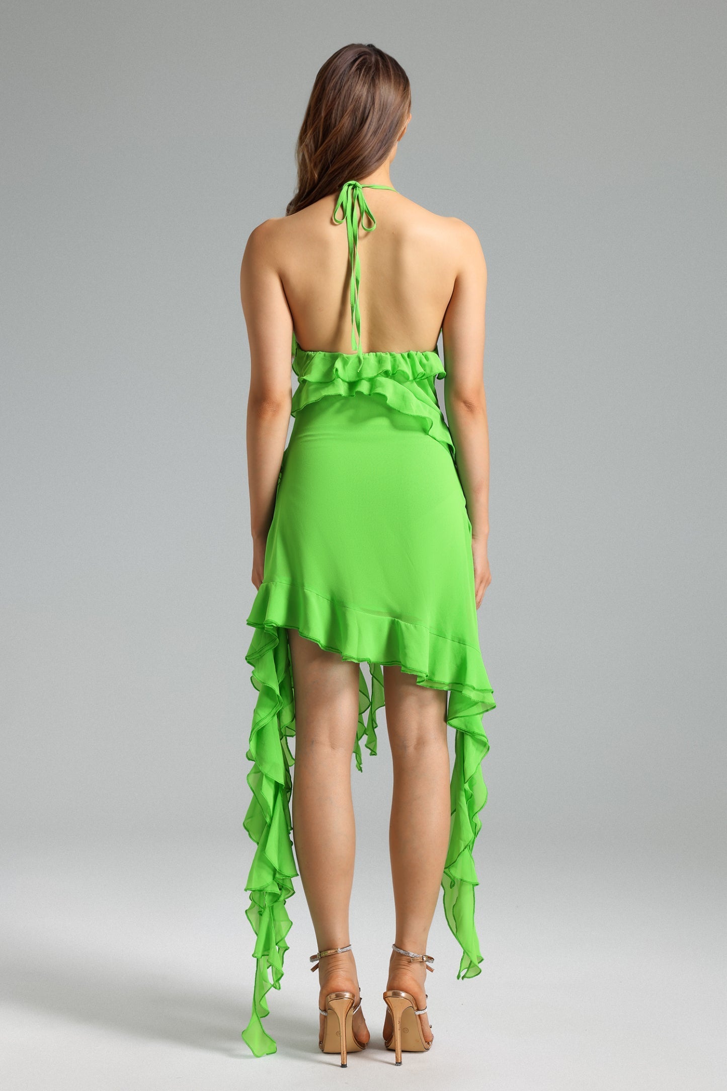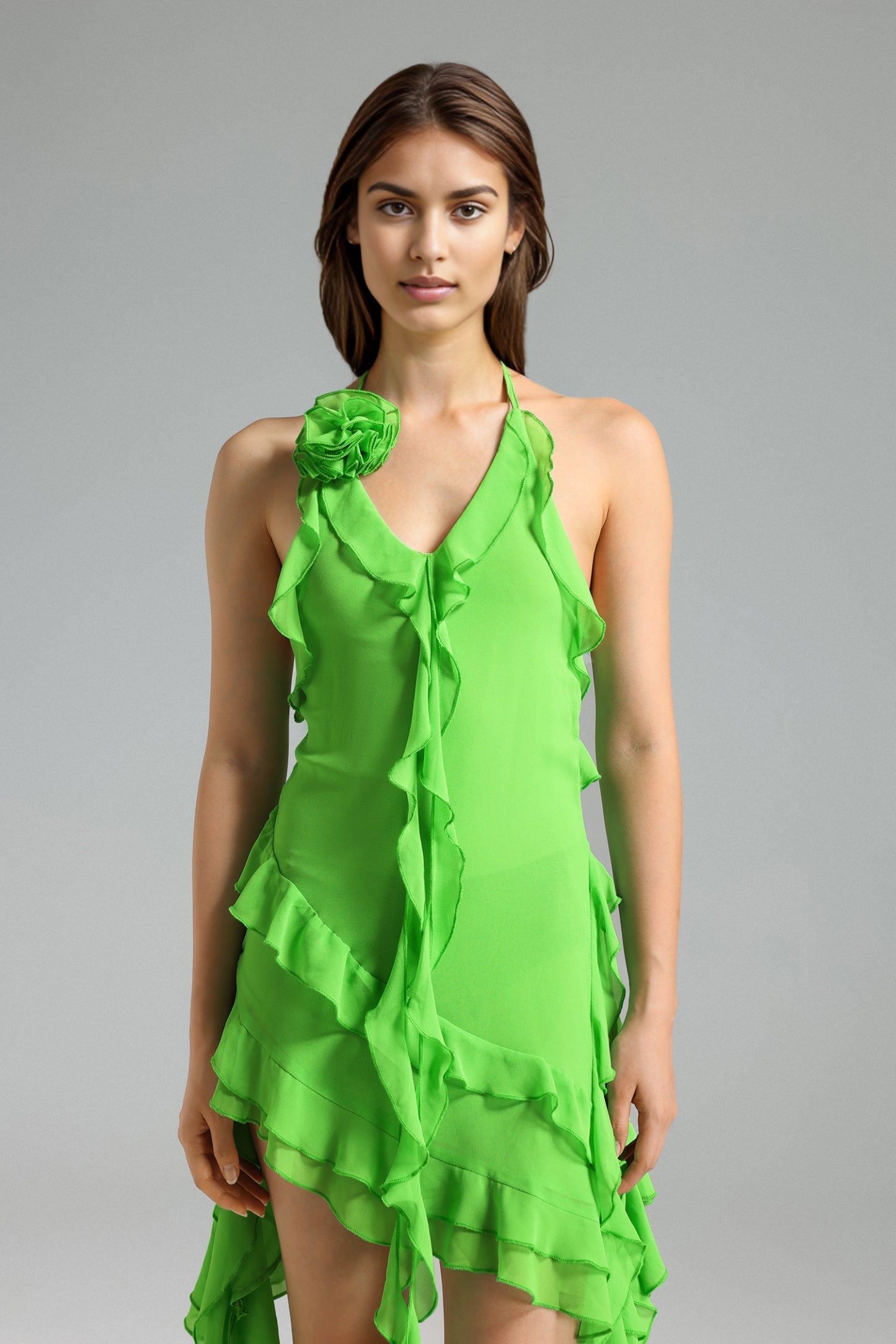 Yeşil Margot Çiçekli Volanlı Halter Mini Elbise: Özel günlerinize eşlik edecek bu elbiseyle dikkat çekin. Canlı yeşil tonu ve zarif çiçek desenleriyle baharı adımlarınıza taşıyın.