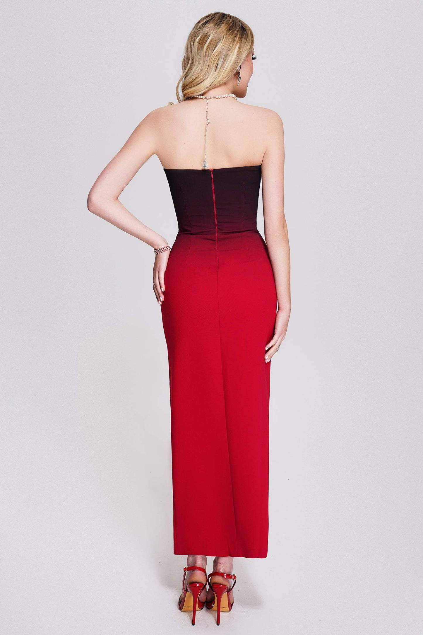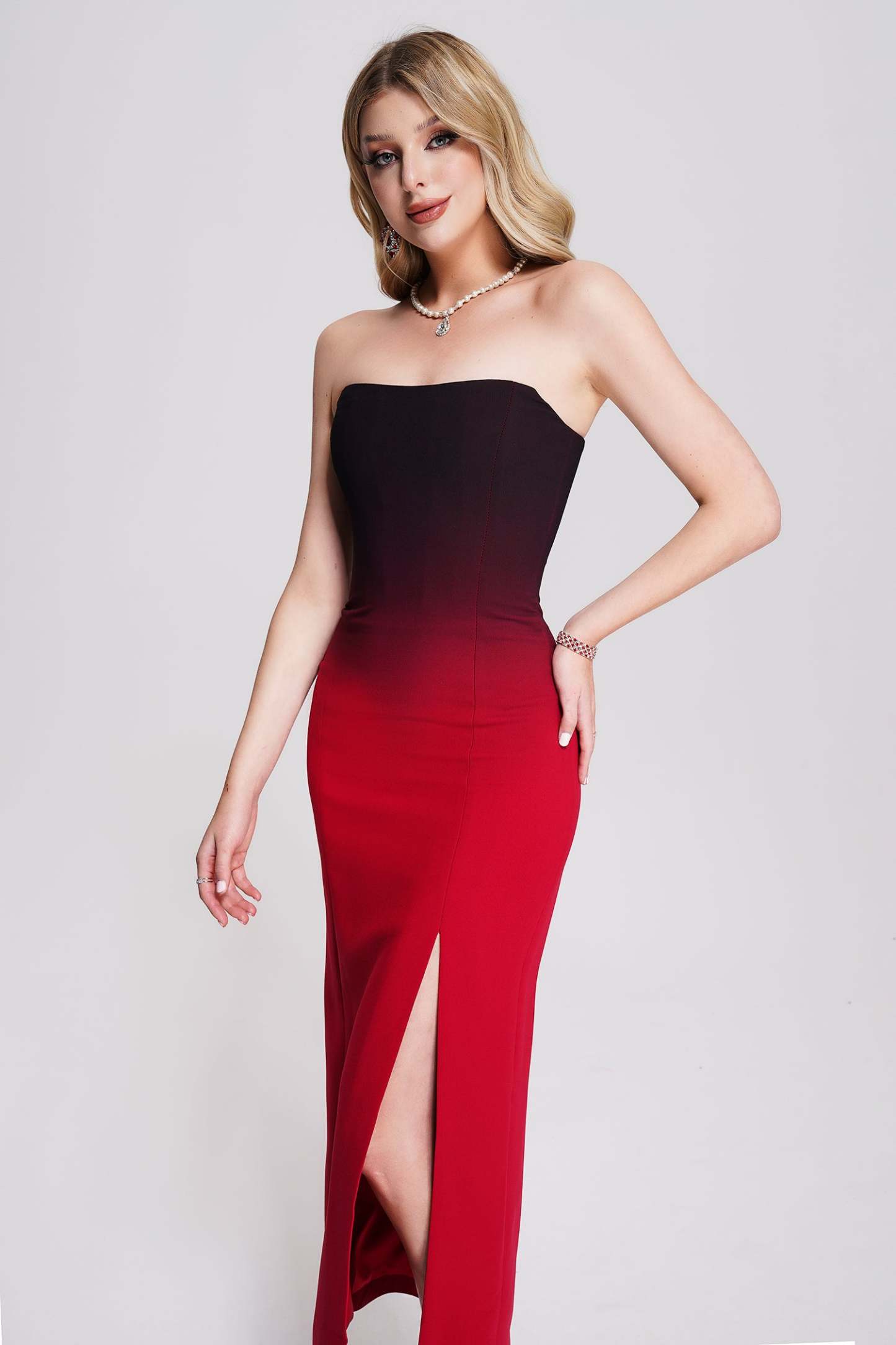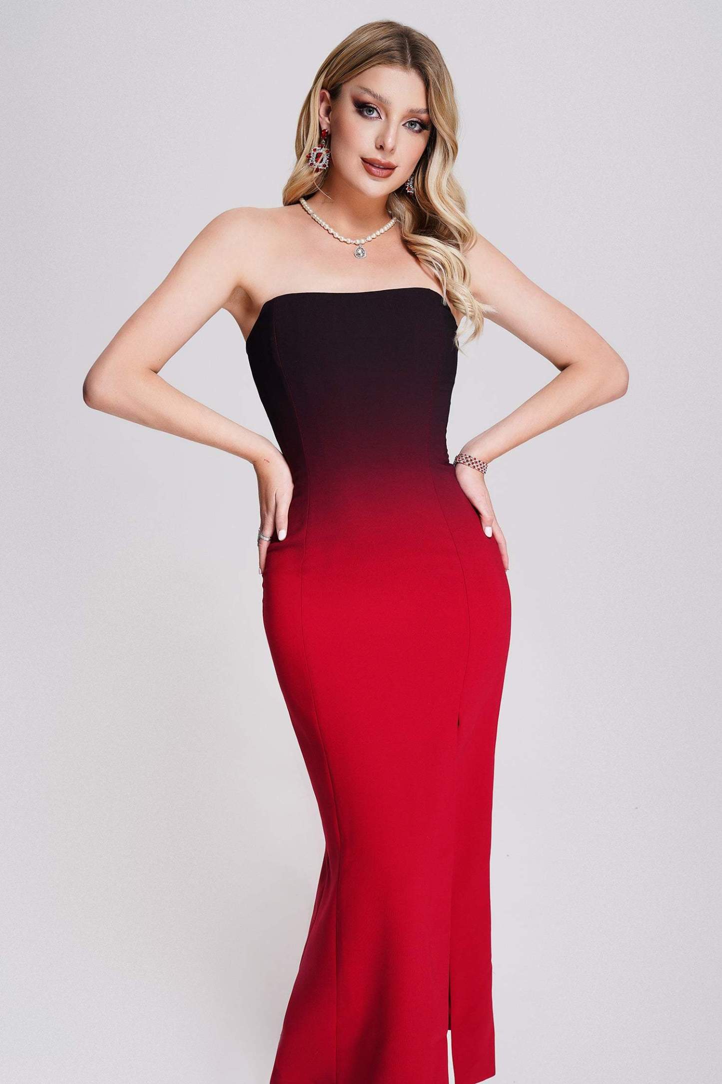 Masaka Strapless Yırtmaçlı Maxi Elbise ile önemli günleriniz için kusursuz bir tercih! Esnek bantaj malzemesinden üretilmiş bu elbise, konfor ve destek sunmanın yanı sıra omuzlarınızı sergileyen açıklıklı kollarıyla dikkat çeker. Belinizi zarifçe ortaya çıkaran dar kesim bel tasarımı, şık ve asil bir midi boy elbise silüetine dönüşür ve yan yırtmaçı ile modern bir görünüm sunar. İnce çizgili tasarımı, gece etkinlikleri ve özel davetler için idealdir. Zarif küpeler ve yüksek topuklu ayakkabılarla kombinleyerek sofistike bir görünüm elde edebilirsiniz.