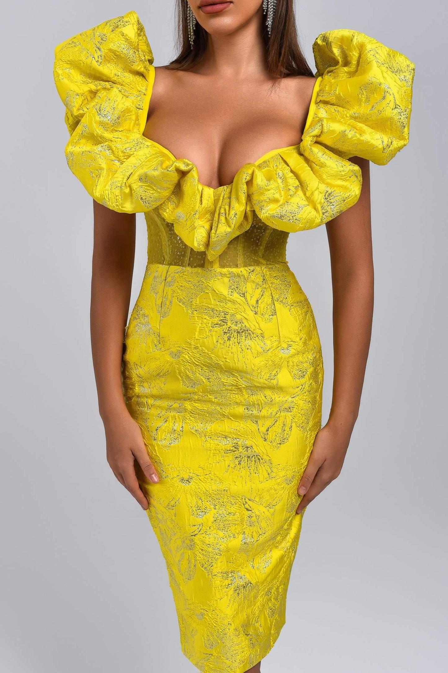 Melany Sarı Jakarlı Midi Elbise ile adımlarınızı büyüleyici bir şıklığa bırakın! Yüksek kalite jakar kumaşın konforunu, büyük dantelli yaka detayı ve çarpıcı desenleri ile birleştiren bu elbise, figürünüzü sararak dikkat çekici bir görünüm sunar. Canlı sarı tonlar, sadece göz alıcı bir görünüm sağlamakla kalmaz, aynı zamanda stilinize modern bir hava katar. Parlak küpeler ve favori çantanız ile görünümünüzü tamamlayın.