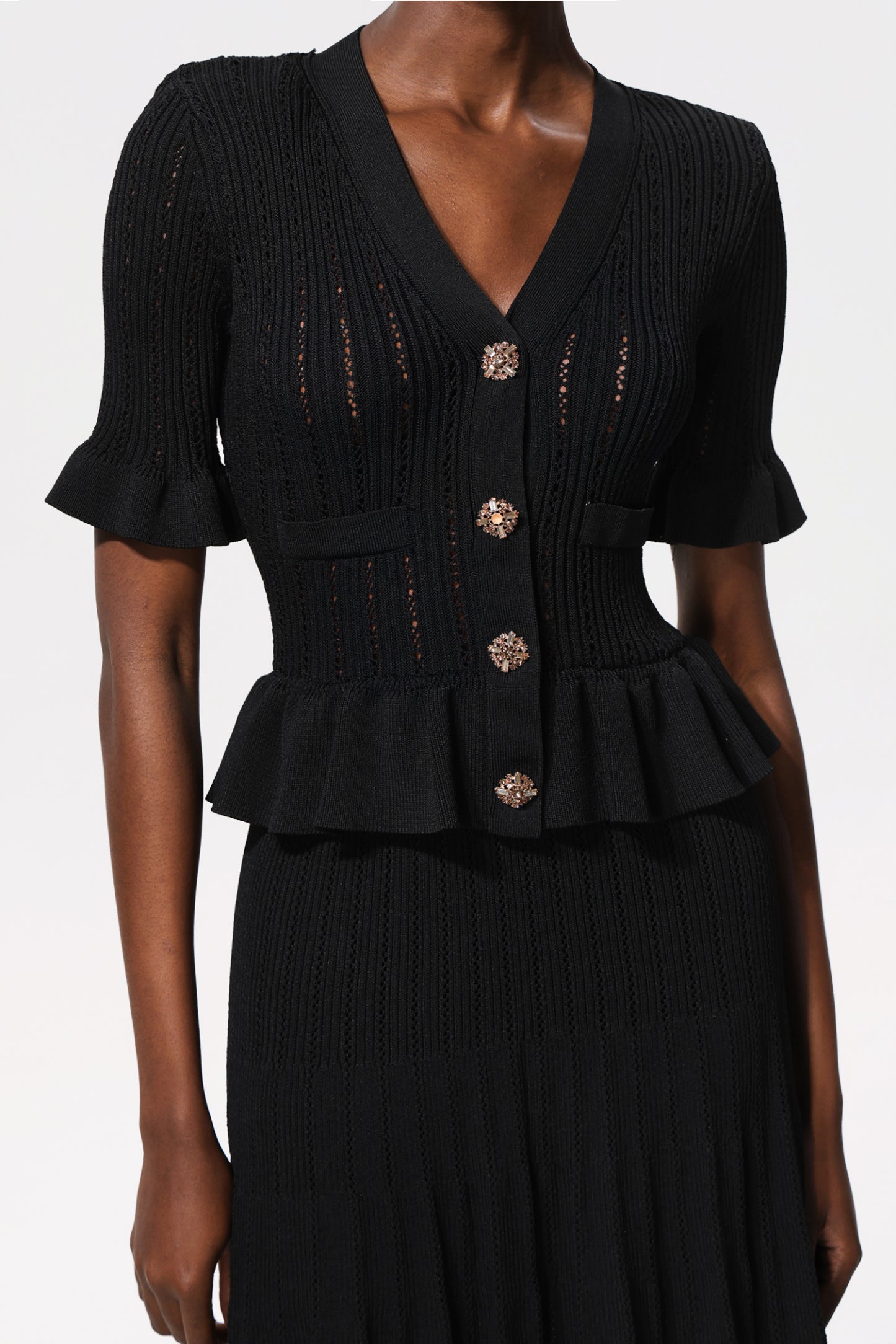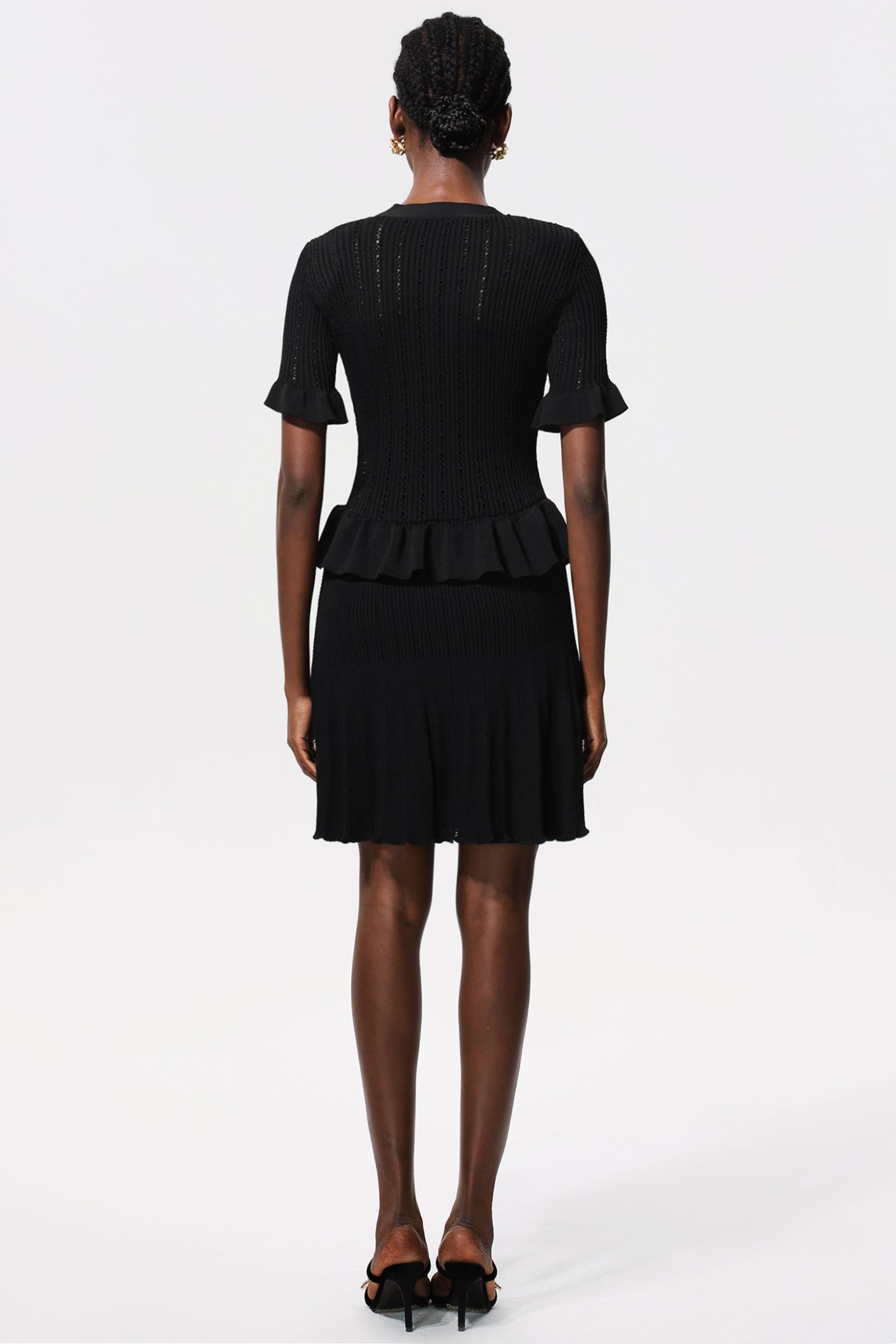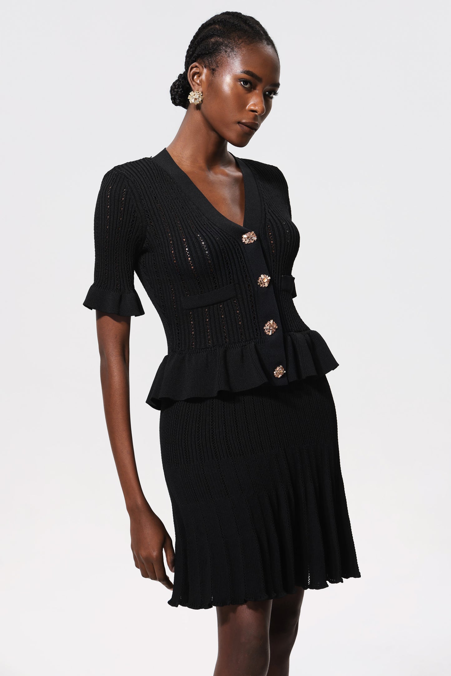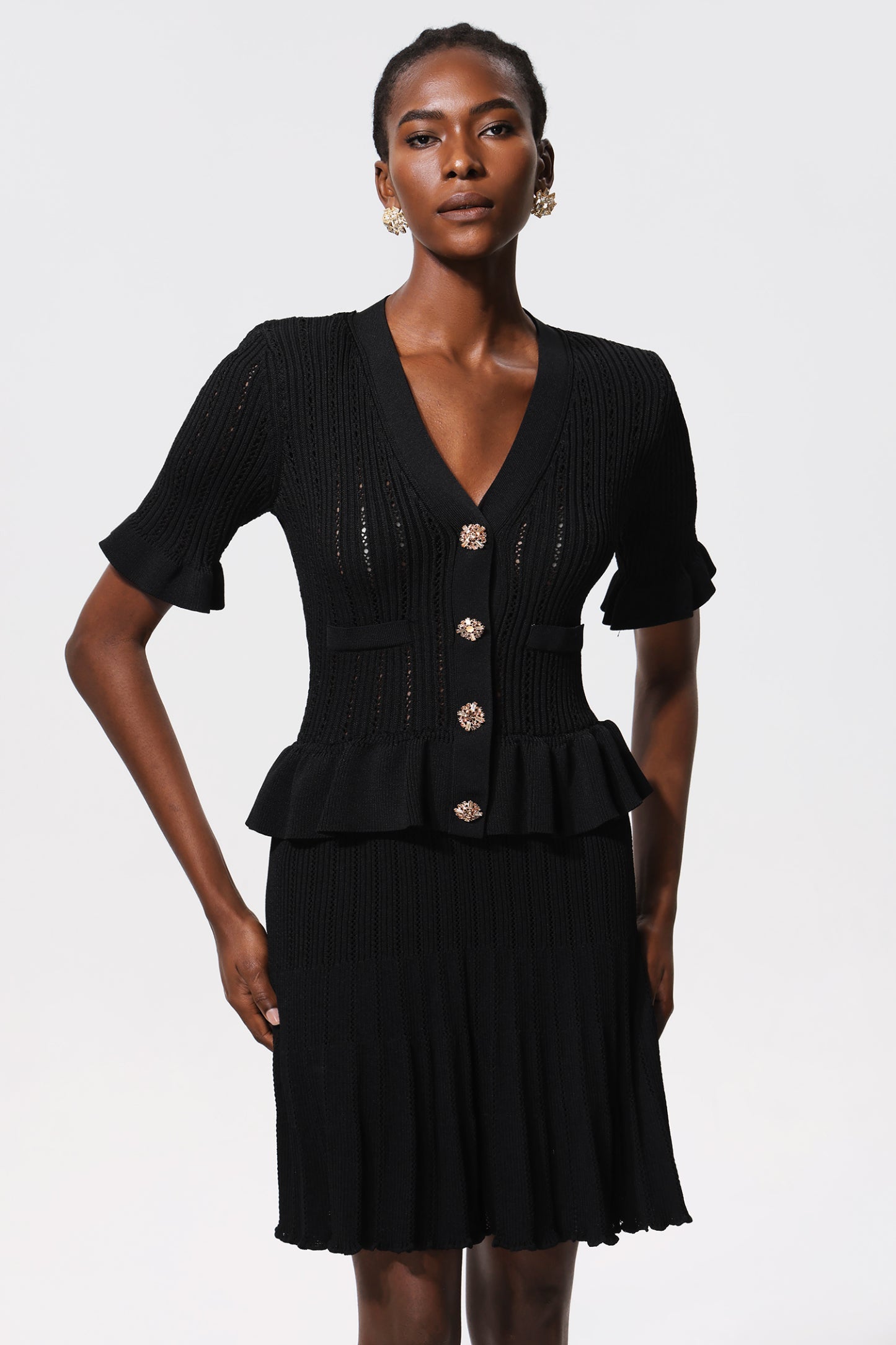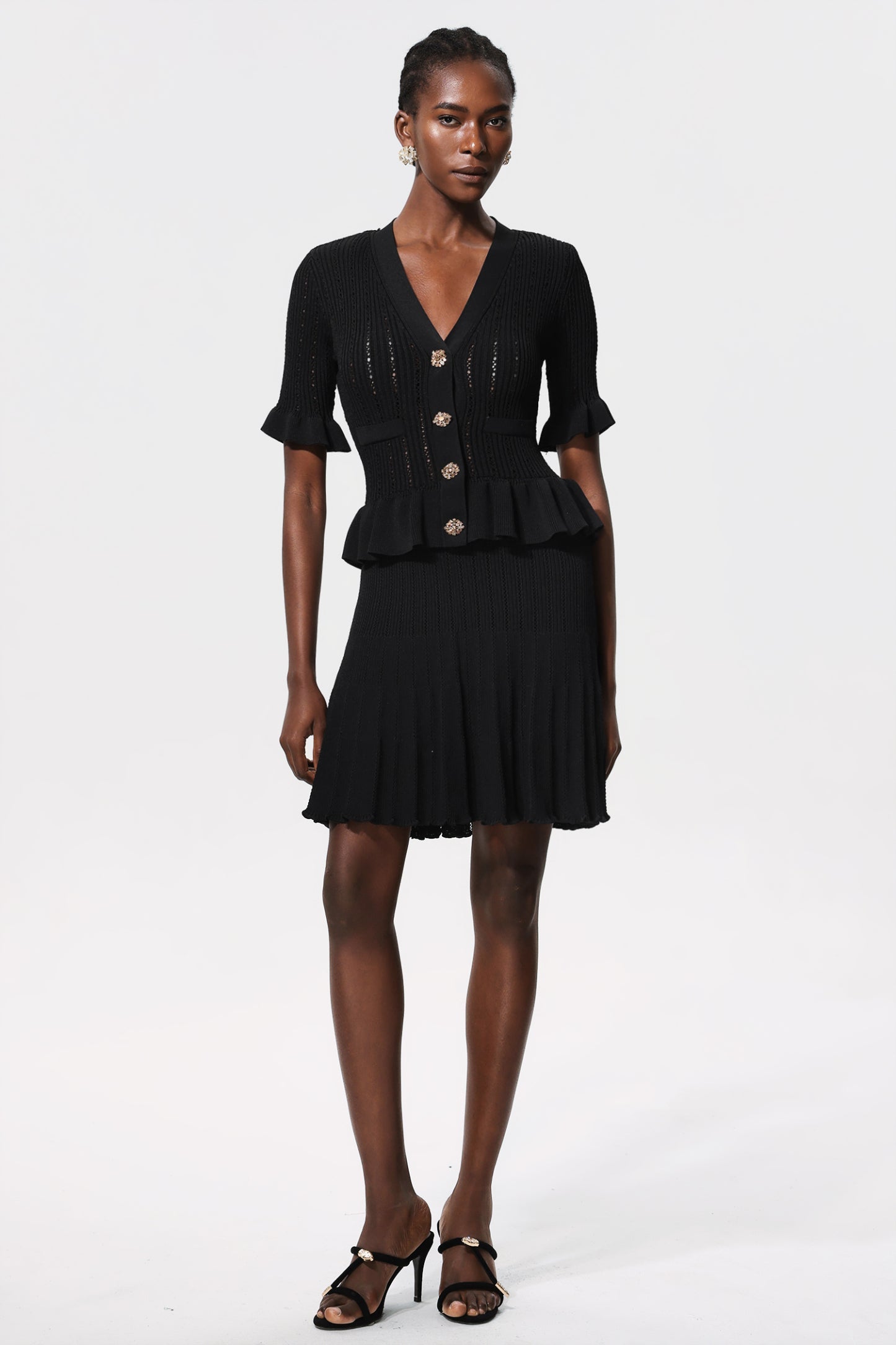 Miopa V Yaka Kısa Kollu Taş Düğmeli Pilili Mini Elbise, özel günlerinizde göz kamaştırıcı bir görünüm sunar. V yakası ve kısa kolları ile feminen bir hava katarken, taş detaylı düğmeleriyle sofistike bir dokunuş sağlar. Esnek kumaş yapısı sayesinde rahat bir kullanım sunan bu mini elbise, pilili tasarımı ile modern ve dinamik bir siluet oluşturur.
