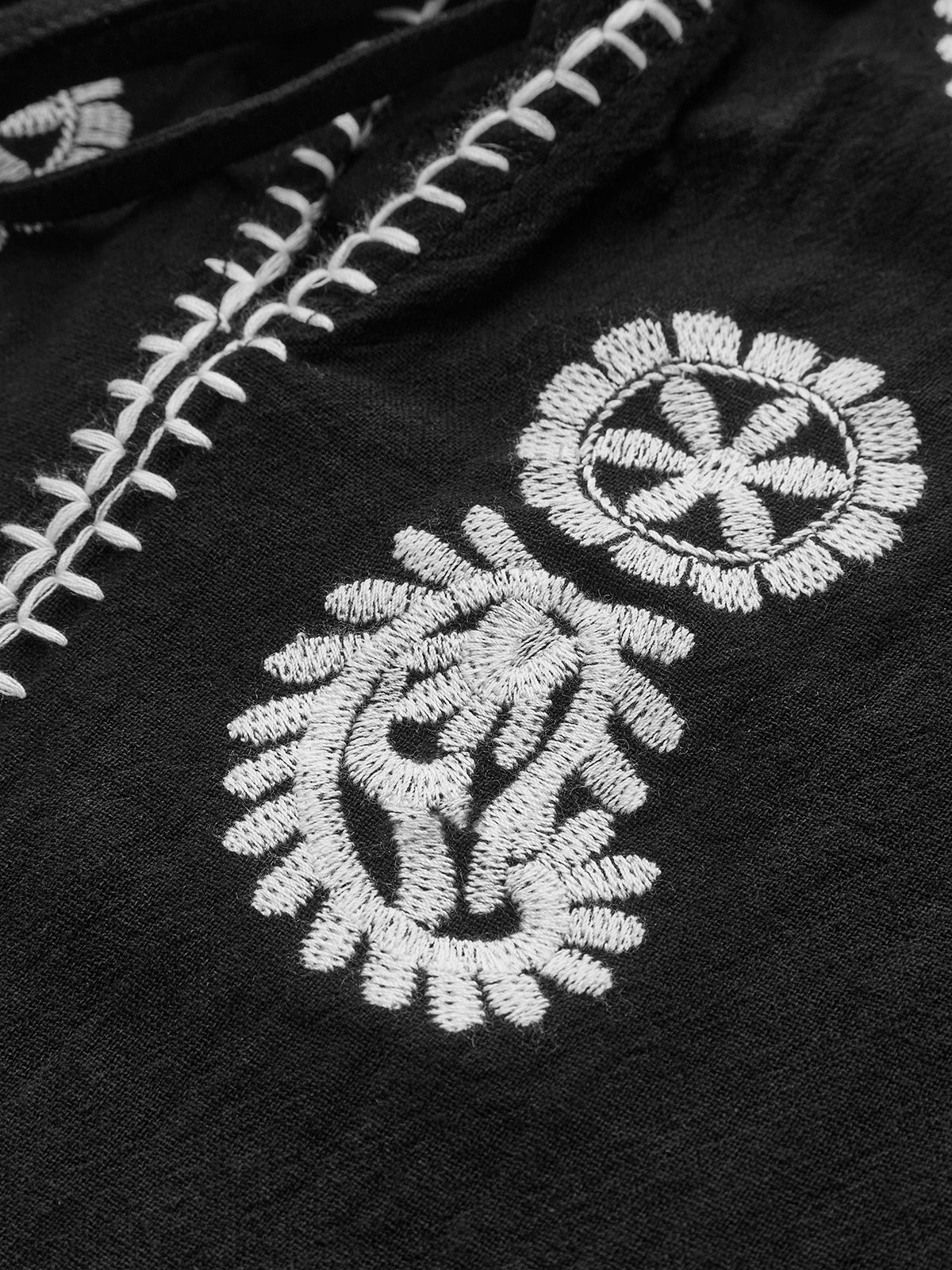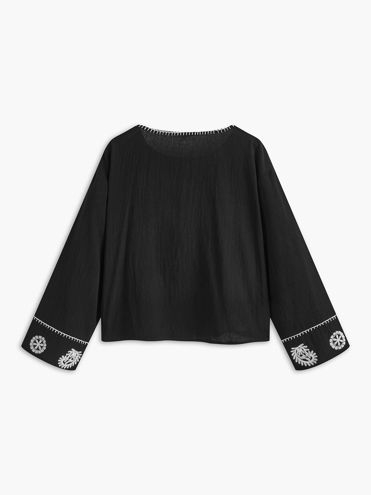 Bu nakış detaylı uzun kollu bluz, %100 pamuklu dokuma kumaşı, bisiklet yaka kesimi ve günlük şıklığı tamamlayan tasarımıyla hem konforlu hem de zarif bir görünüm sunuyor. Nefes alabilen ve hafif yapısıyla, günlük kullanım ve tatil kombinleri için mükemmel bir seçimdir.