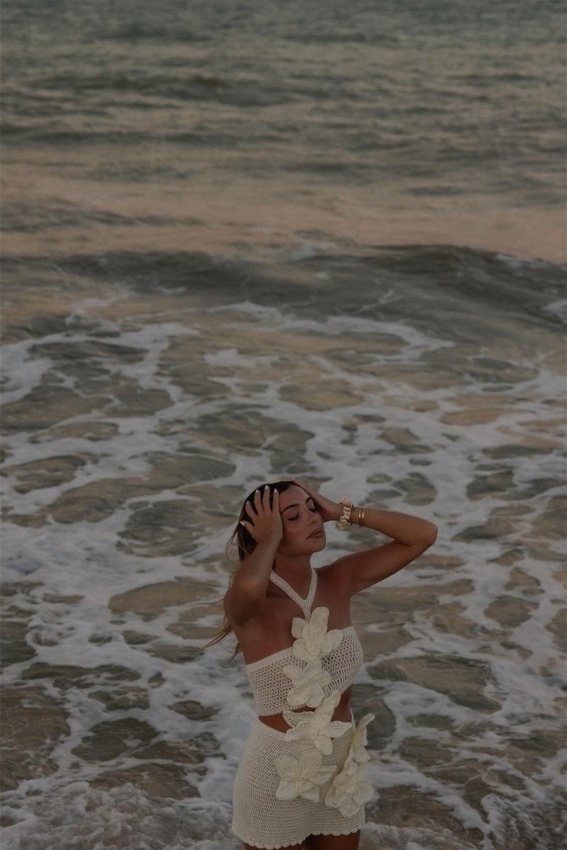 • Kesim, Halter Yaka, Örgü Çiçek Detayı, Kolsuz, Mini Boy.
