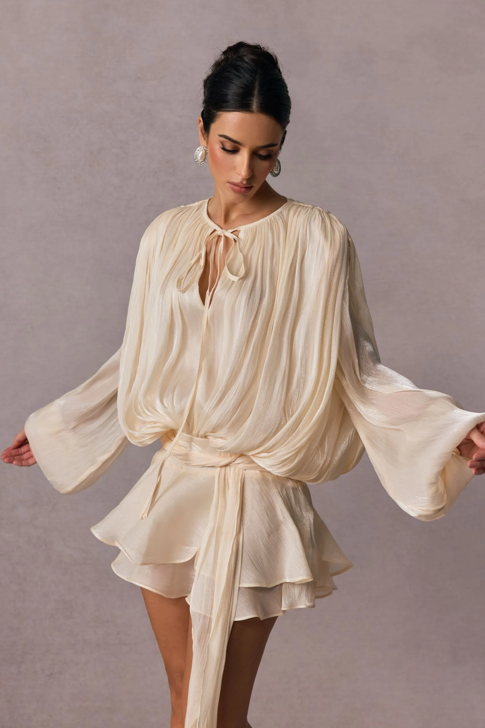 Dönme Tasarımı, Omuz Pedleri, Drapeli Tasarım, Tam Pileli, Volanlı Kenar, Mini Uzunluk.