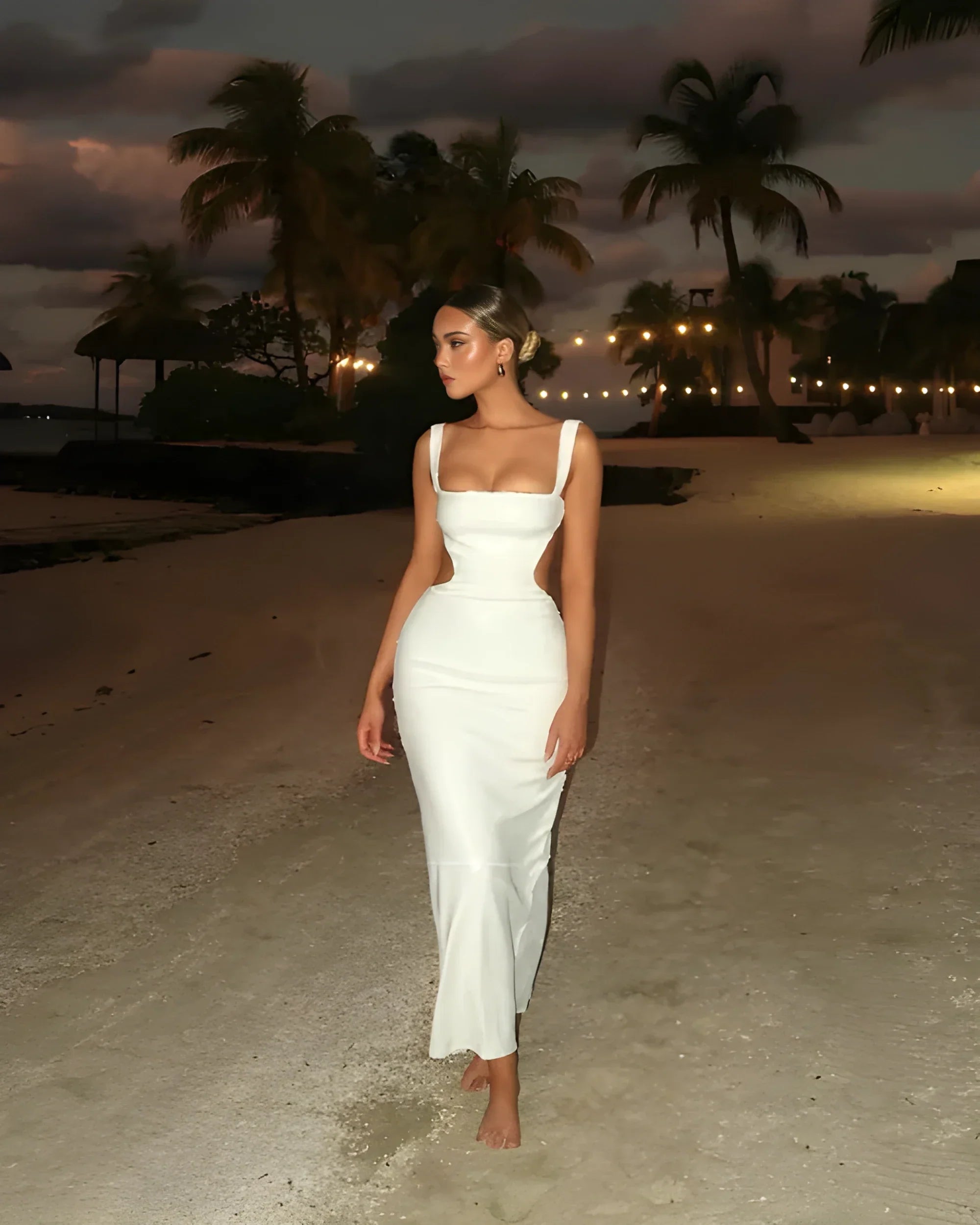 Kalın askılı, kare yaka, vücuda tam oturan parlak dokulu kumaş, açık sırt detayı ve uzun düz kesim maxi boy.