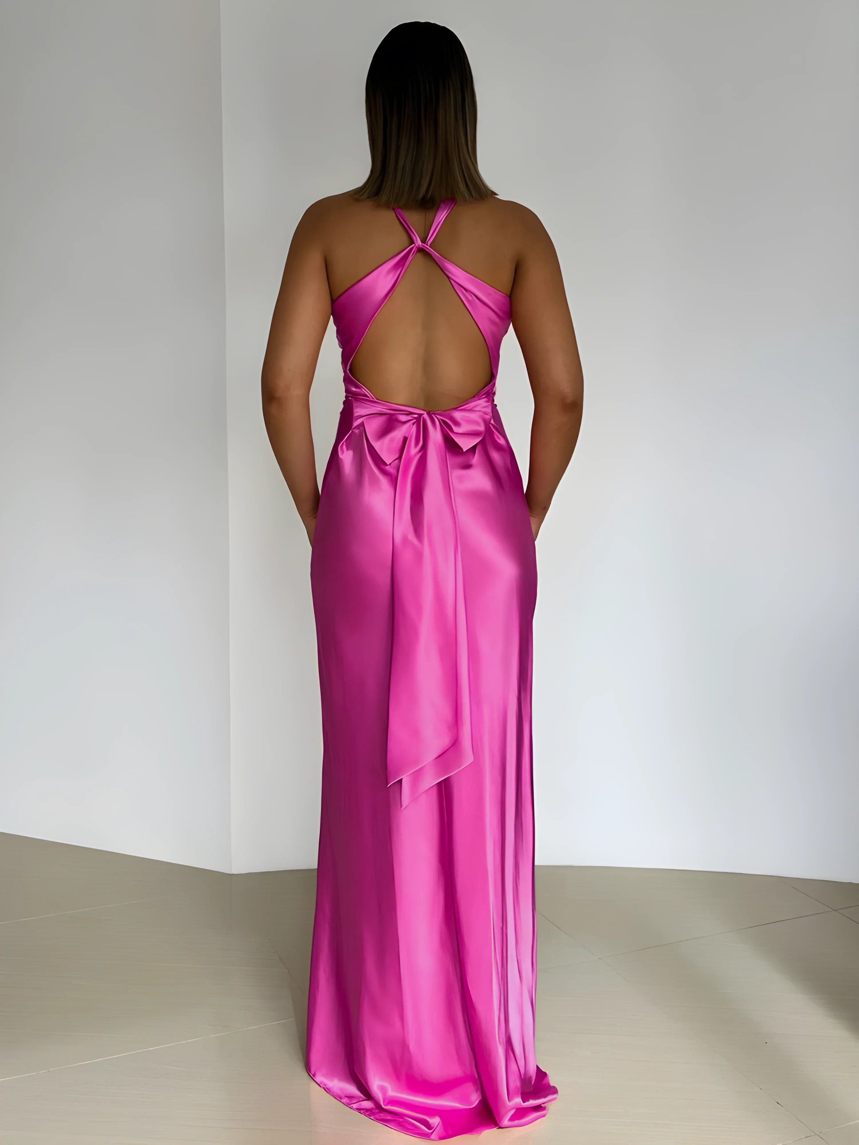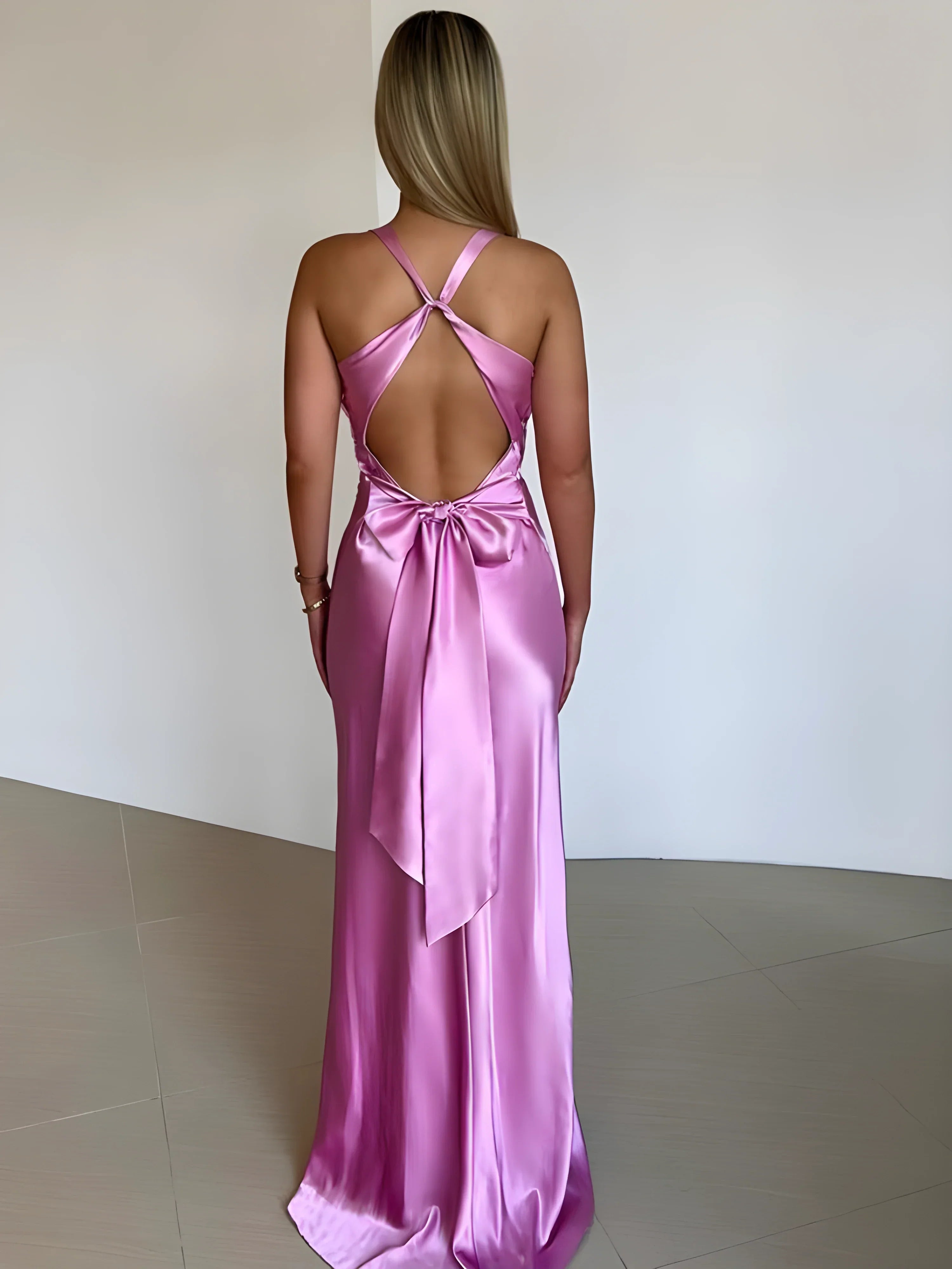 V yaka, bükümlü göğüs detayı, çapraz sırt askısı ve sırt dekoltesi, kuşak bağlamalı bel detayı, A kesim etek, parlak saten dokulu uzun maxi boy.