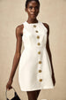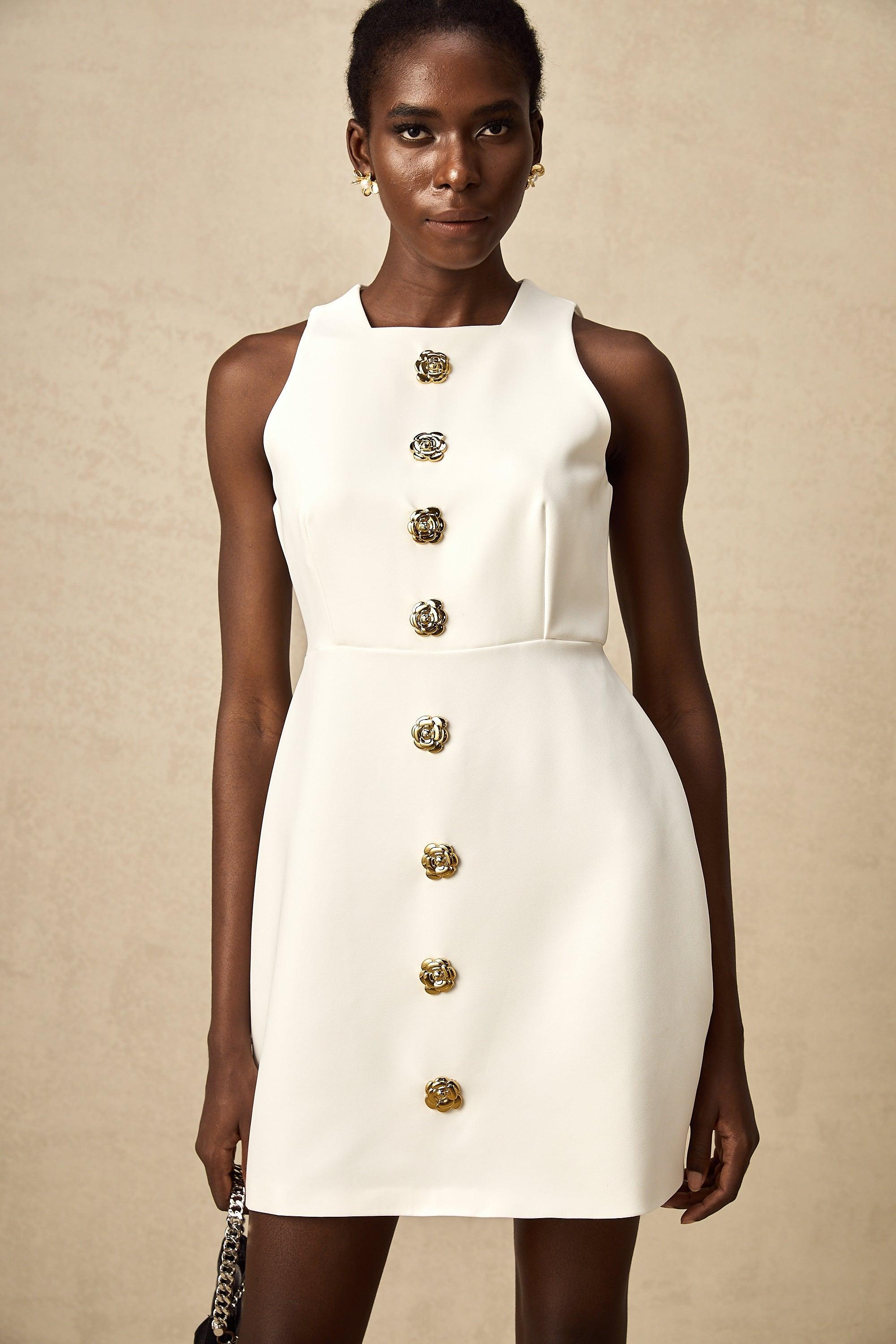 "Opulent Bloom" mini elbise, zarif kesimi ve göz alıcı altın gül detaylı düğmeleriyle sofistike bir şıklık sunuyor. Modern ve zarif bir görünüm arayanlar için mükemmel bir seçim. Hem resmi davetlerde hem de özel etkinliklerde stilinizi ön plana çıkarın.