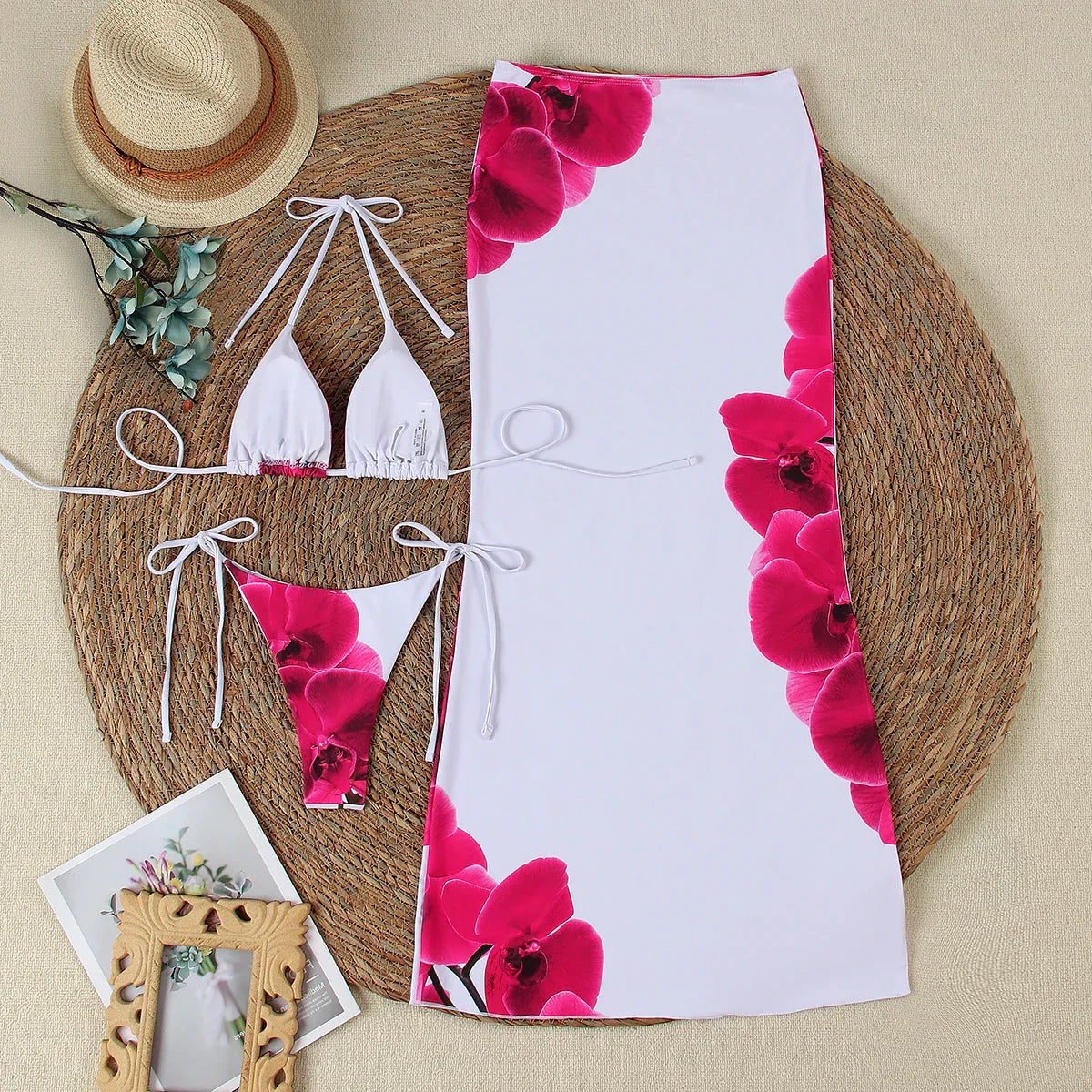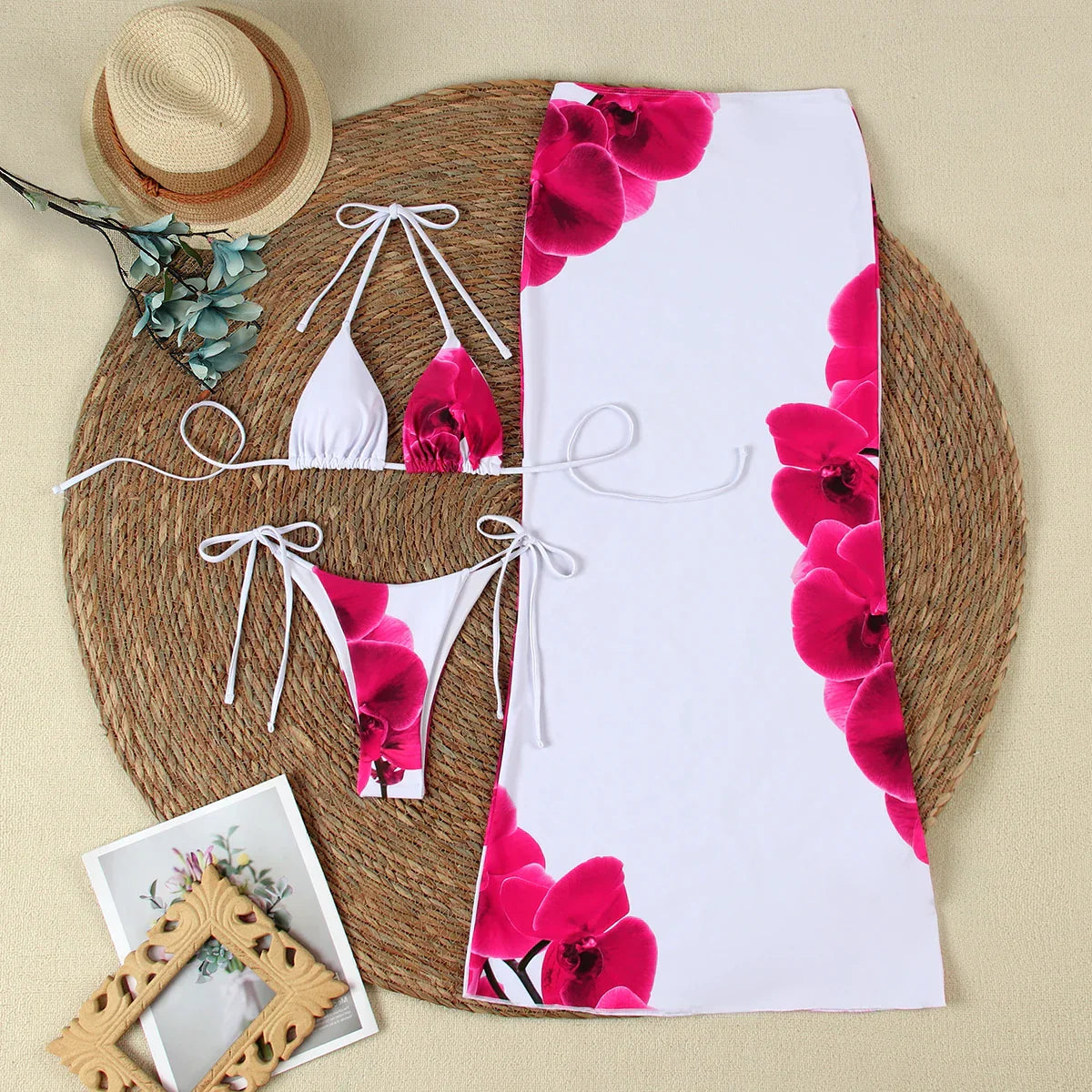 Tropik şıklığın zarif yorumuyla hazırlanan bu üç parçalı set, sahil stilinize çarpıcı bir dokunuş katıyor. Beyaz zemin üzerine canlı orkide desenleriyle hareketlenen tasarım, klasik üçgen bikini kesimiyle feminen bir görünüm sunarken, uyumlu uzun pareo etek plaj stilinizi tamamlıyor. Gündüz güneşlenirken, akşam beach davetlerine uzanan şık bir alternatif.