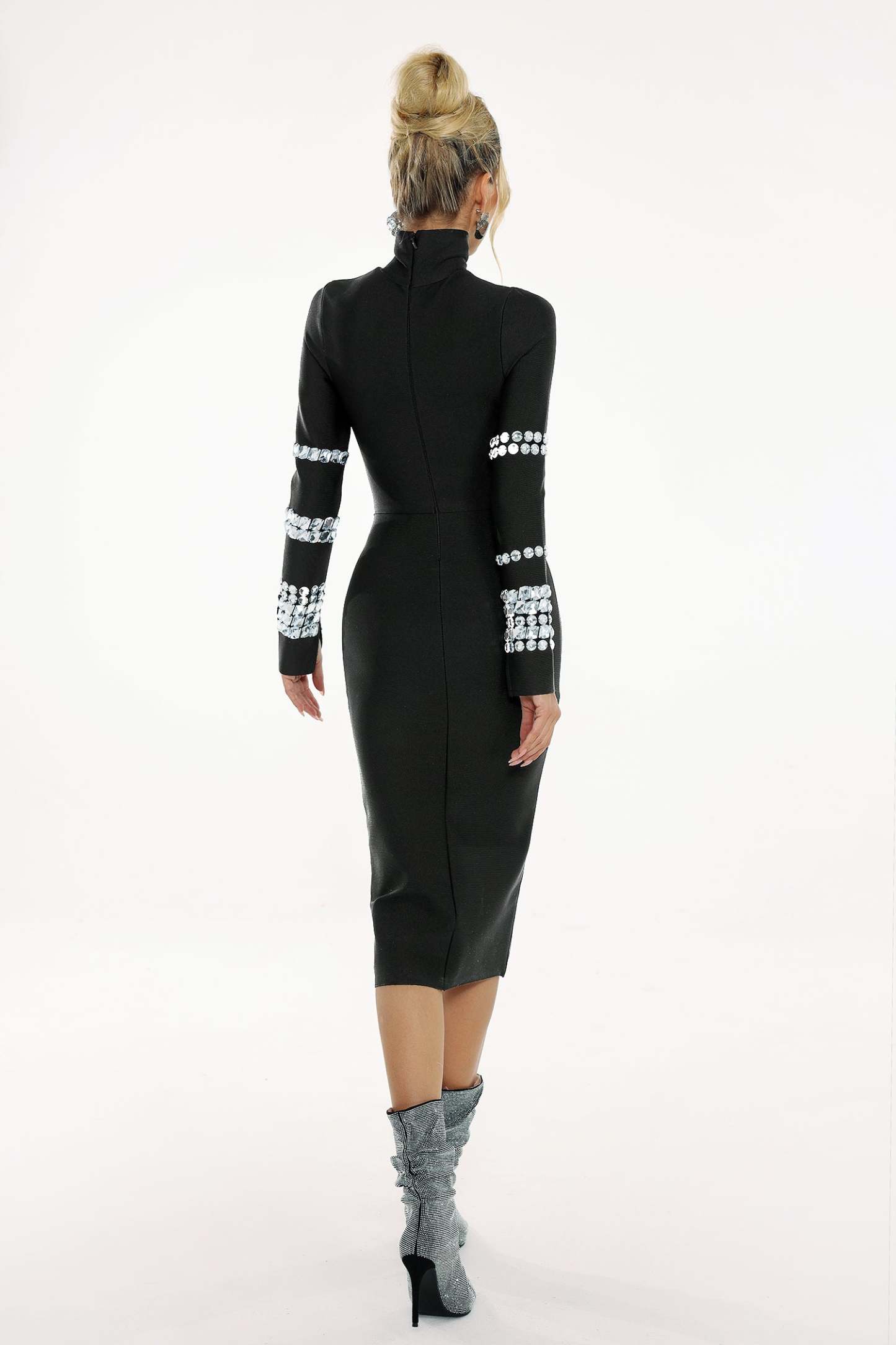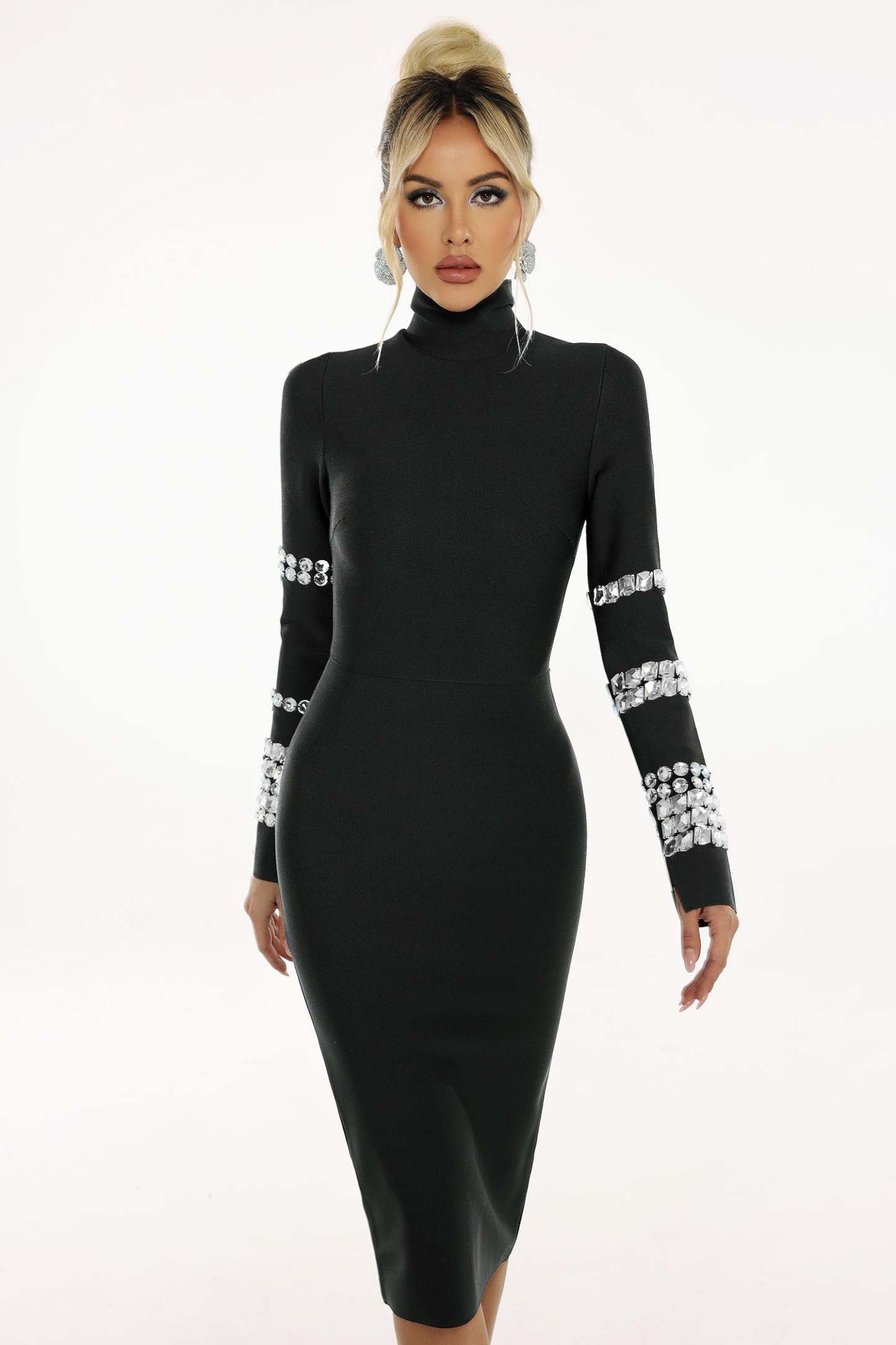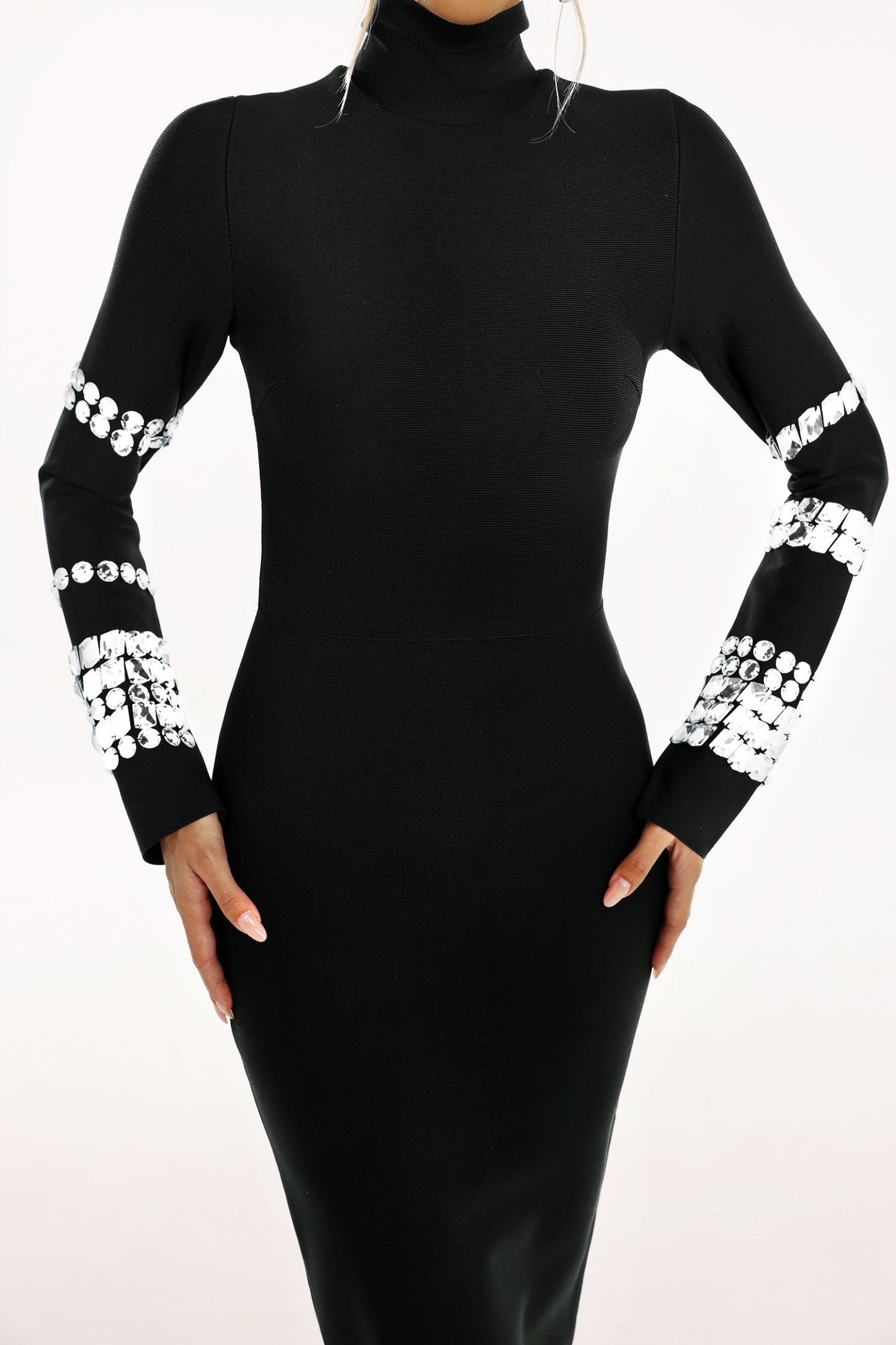 Phoebe Taş Detaylı Uzun Kollu Bandaj Elbise, özel günlerinizde göz kamaştırıcı bir görünüm sunar. %95 polyester ve %5 spandex kumaş içeriği ile esnek bir yapıya sahip olan bu elbise, vücut hatlarınıza tam oturur. Elde yıkama ile temizlenmesi önerilen bu ürün, modelin S beden giydiği fotoğraflarda size rehber olabilir.