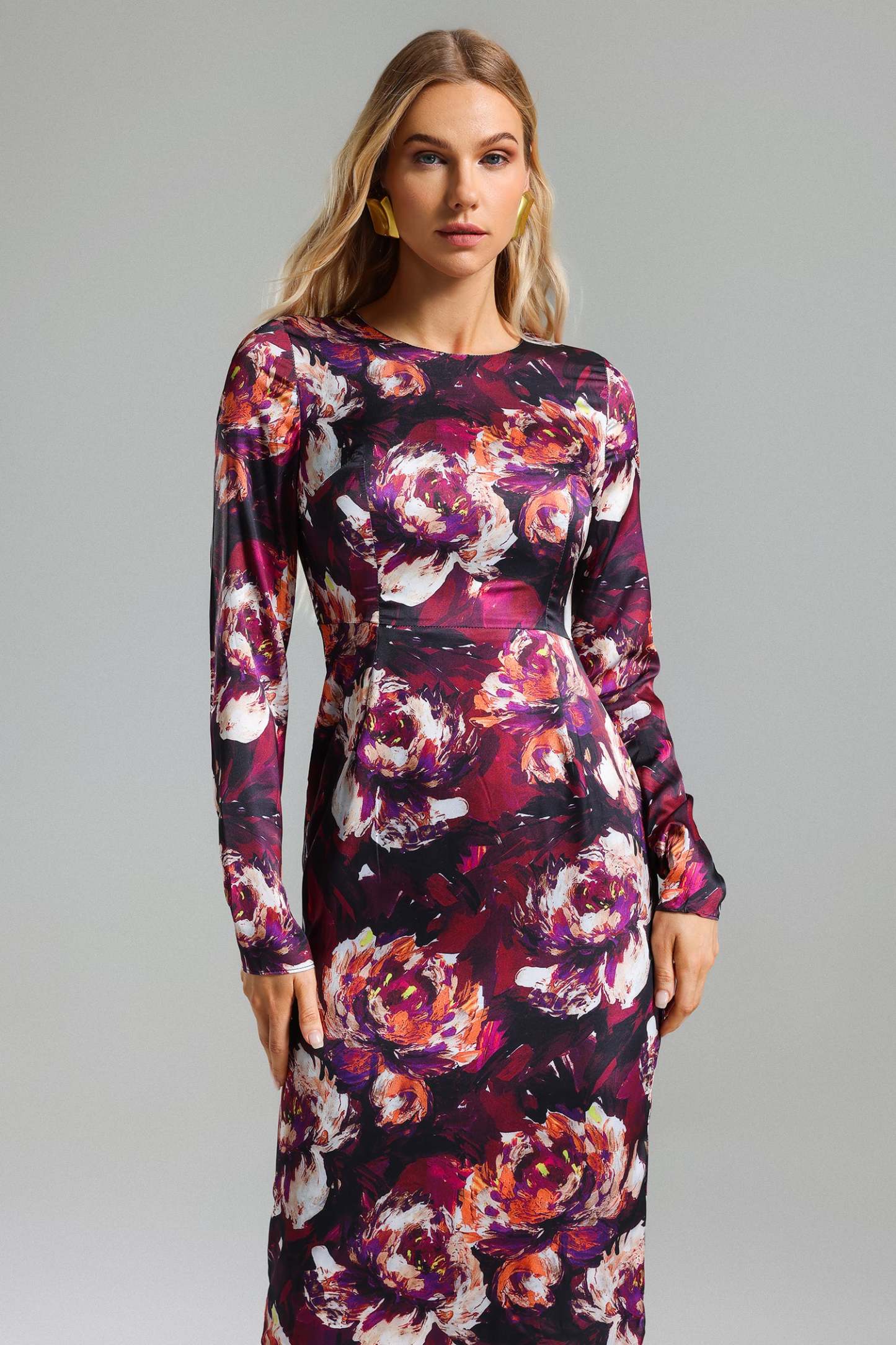 Elbisenin saten dokusu, size zarif bir parlaklık sunarken, esnek yapıda olması konforunuzu artırır. Çiçek desenleriyle süslenmiş bu midi boy elbise, gece davetlerinden, günlük şık toplantılara kadar her ortamda rahatça kullanılabilir. Bedeninize mükemmel uyum sağlayacak şekilde tasarlanan bu ürün, beden tablomuza uygun olarak kesilmiştir. En iyi uyumu sağlamak için lütfen sunulan beden tablosuna göz atınız.