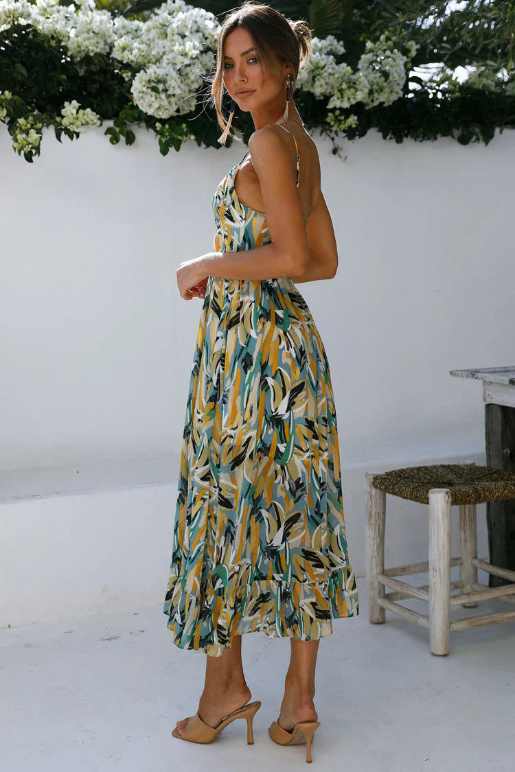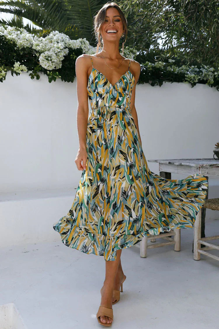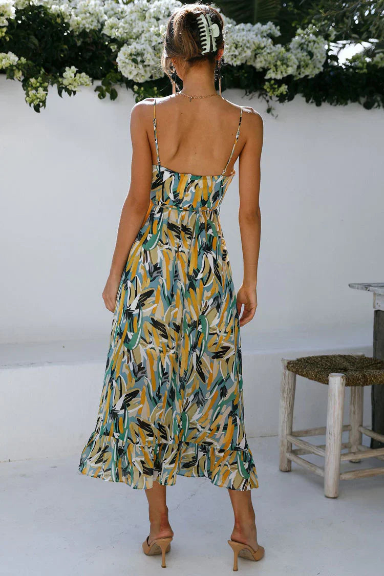 Kamelia Baskılı Pileli V Yaka Elbise