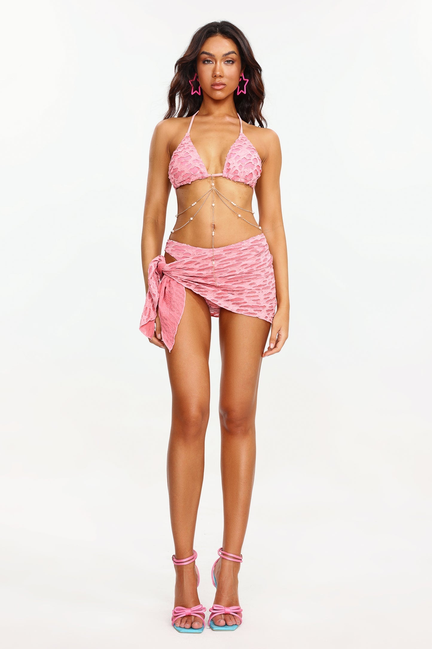 Sarna Zincirli Üç Parça Bikini Takımı, plaj partileri ve özel davetler için mükemmel bir seçimdir. Zamansız tasarımı ve kaliteli kumaşıyla dikkat çekerken, %82 polyester ve %18 spandeks içeriği sayesinde esneklik ve rahatlık sunar. Modelin giydiği S beden, cesur ve özgün stilinizi ön plana çıkaracak şekilde kesilmiştir.