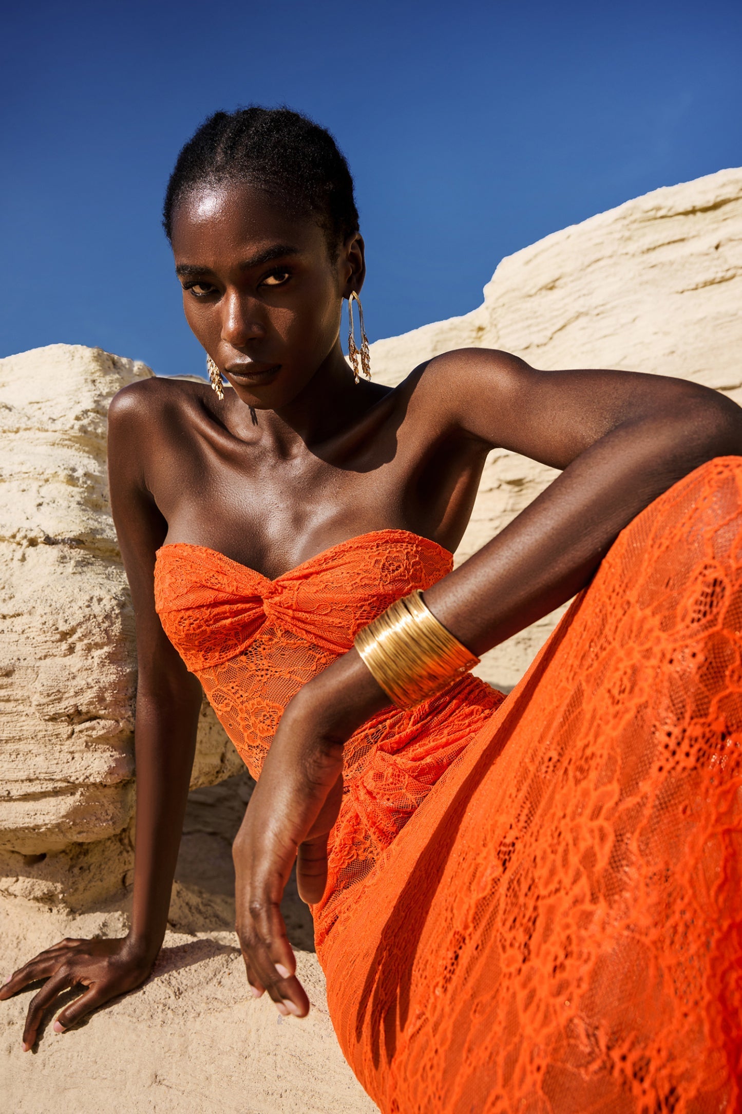 Selien Dantelli Kolsuz Uzun Elbise, vücut hatlarınızı nazikçe kucaklayacak şekilde tasarlanmıştır. Göğüs, bel ve kalça kısımlarında yer alan esnek yapı, size mükemmel bir uyum sunar. İnce dantel detayları ile zarafeti bir araya getiren bu elbise, özellikle gece davetleri veya özel etkinlikler için idealdir.