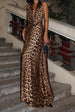 Bu boyundan bağlamalı, leopar desenli elbise, cesur bir zarafet yayıyor. Derin V yakalı ve sırtı açık tasarıma sahip bu model, göz kamaştıran yüksek bel ve akıcı maksi uzunluğuyla silüetinizi vurguluyor. Partilerde veya görkemli akşam etkinliklerinde dikkat çekmek için mükemmeldir.