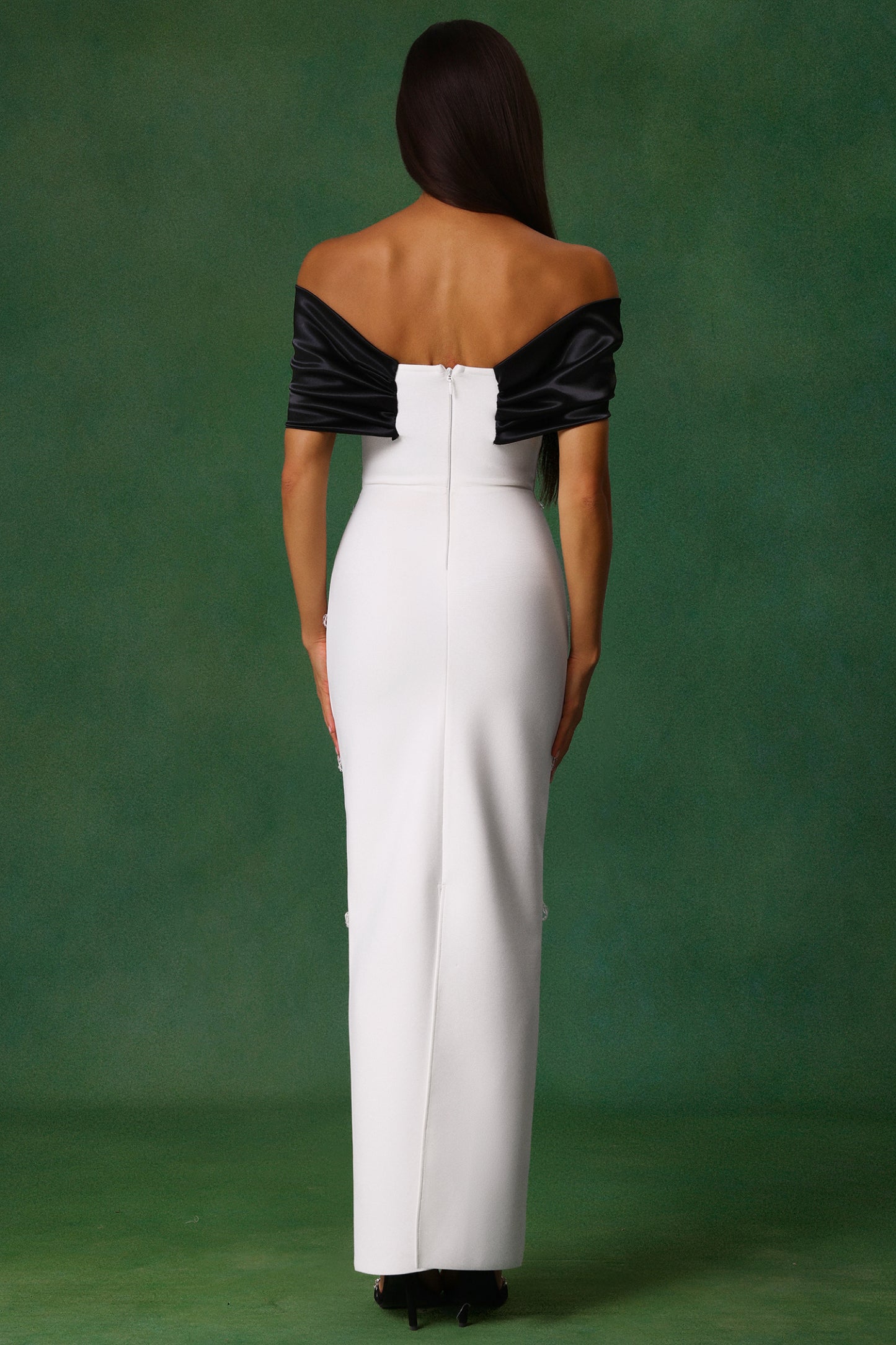 Omuzları zerafetle açığa çıkan bu uzun elbise, bedeni sararak şekil alan esnek kumaşıyla ideal bir uyum sunar. Göz alıcı taş detaylar ile süslenmiş olan elbise, davetlerde veya özel gece etkinliklerinizde tüm gözleri üzerinize çekecek. Modelin üzerinde S beden elbise bulunmaktadır.