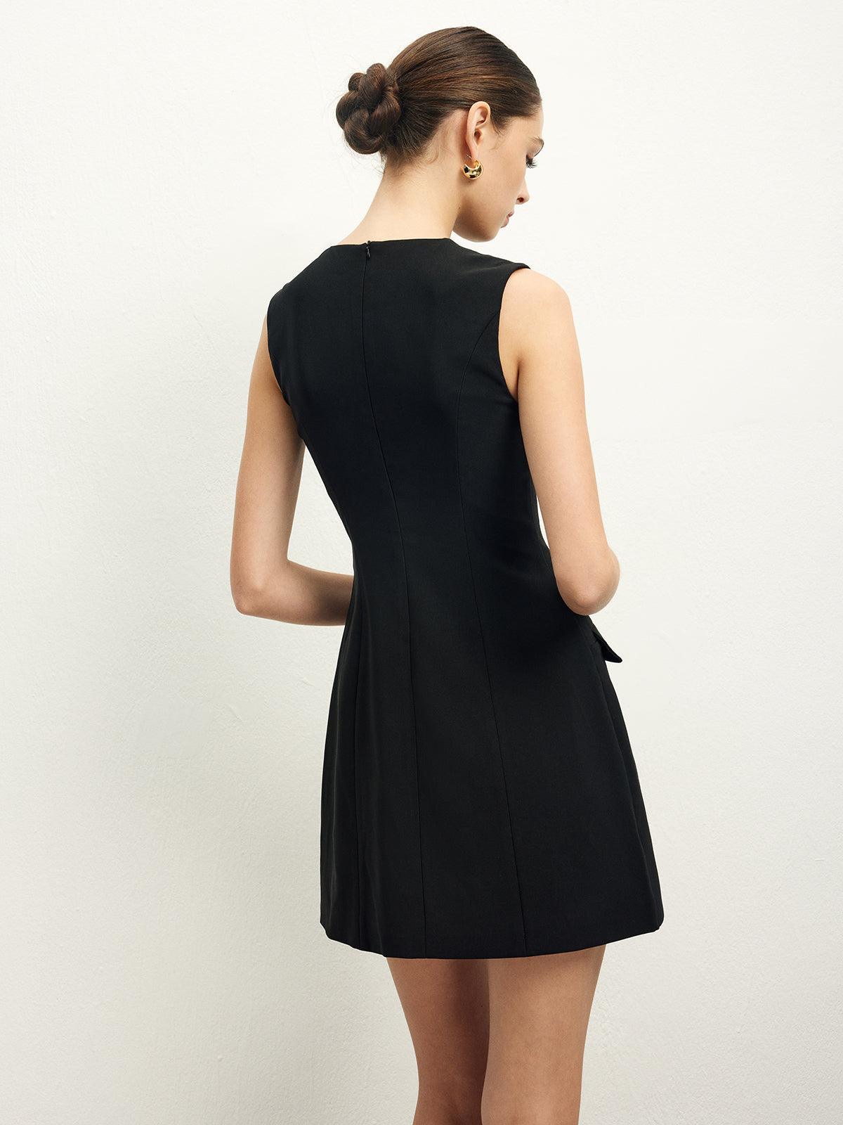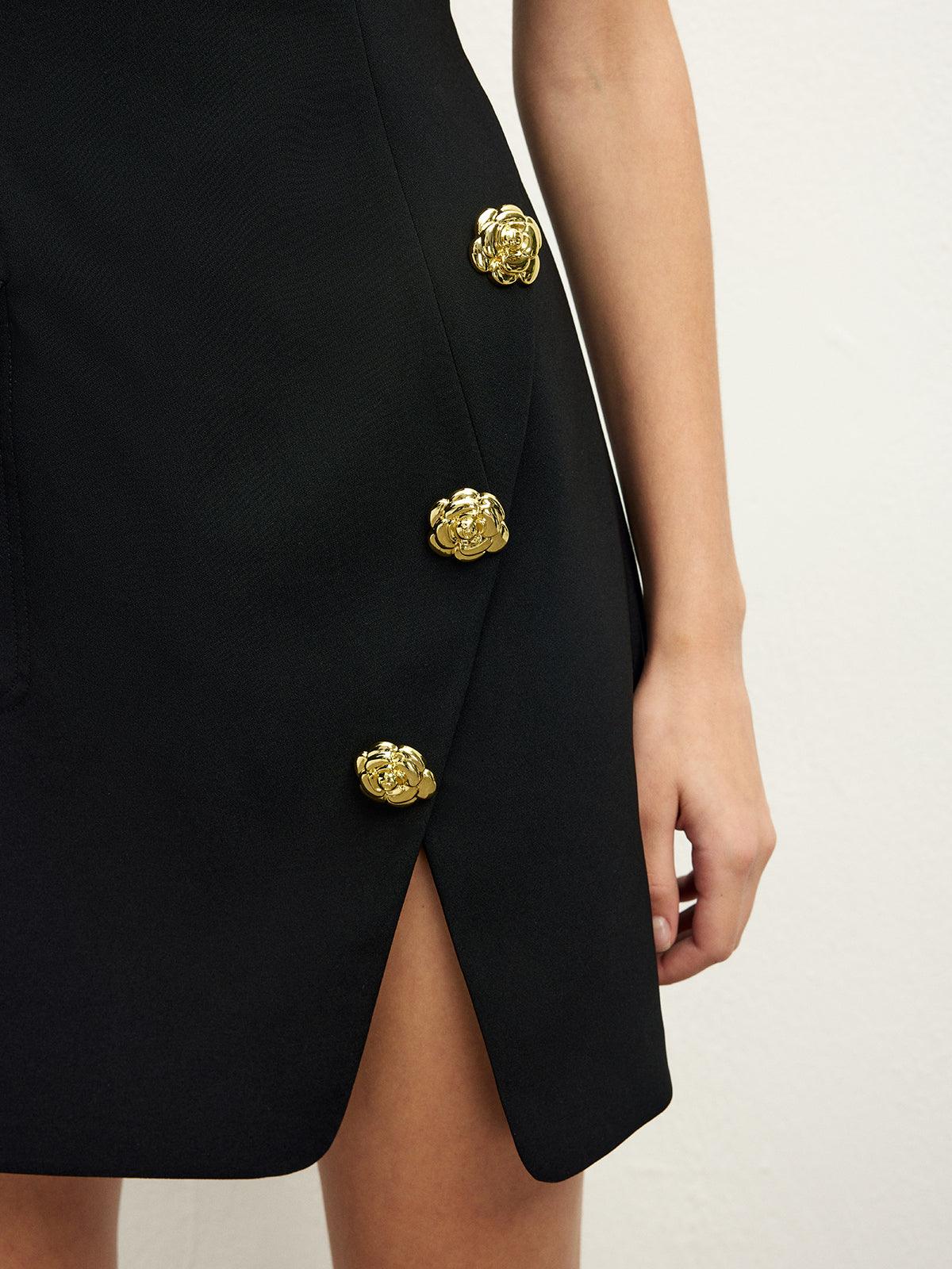 Şık ve zarif tasarımıyla öne çıkan bu siyah mini elbise, altın düğme detaylarıyla sofistike bir görünüm sunuyor. Özel davetler ve gece şıklığı için vazgeçilmez bir parça!