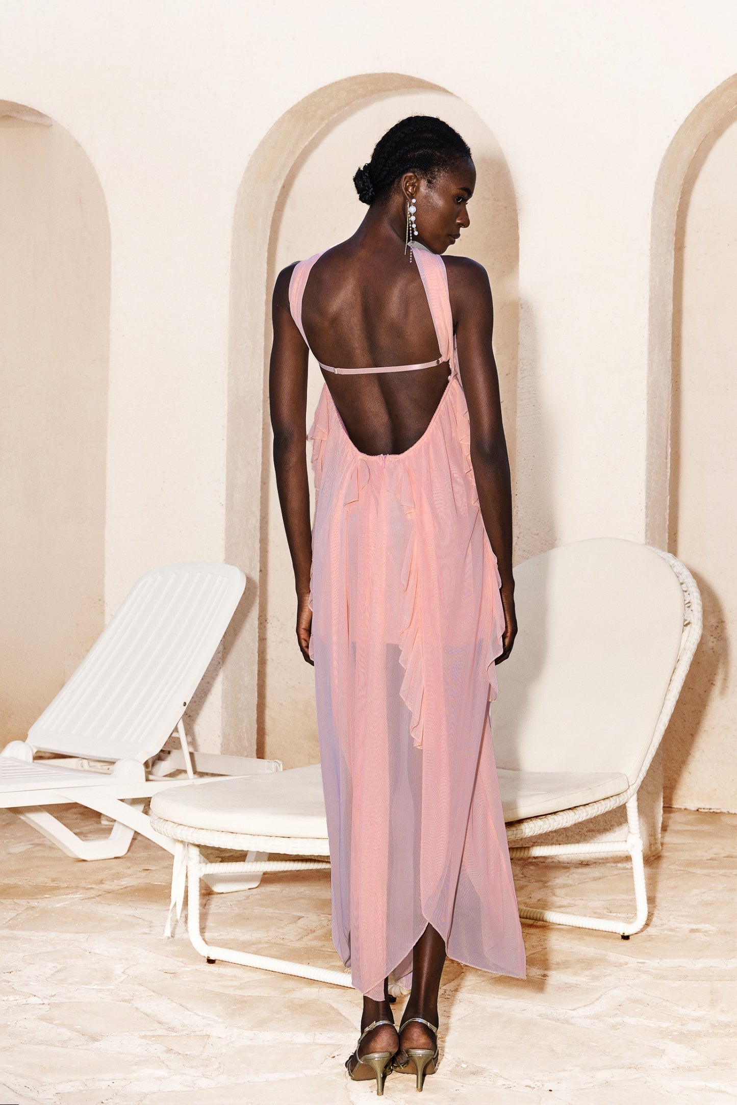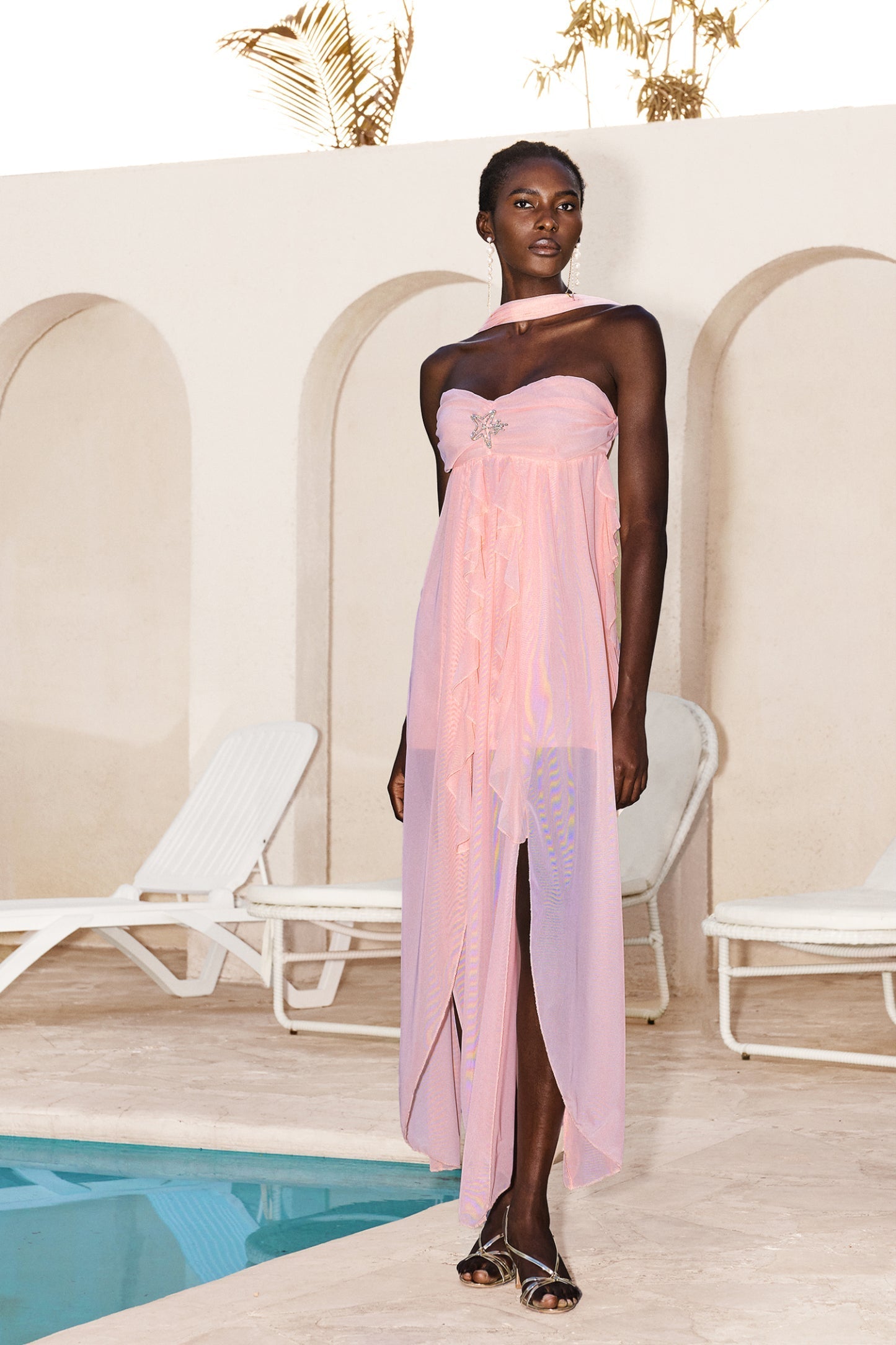 Tati Halter Yaka Volanlı Maksi Elbise, vücut hatlarınıza mükemmel uyum sağlayacak şekilde tasarlanmıştır. Göğüs, bel ve kalça bölgelerinde kullanılan esnek kumaş sayesinde rahat bir kullanım sunar. Volan detayları ile feminen bir dokunuş kazandırılan bu elbise, gece davetlerinden özel etkinliklere kadar geniş bir kullanım alanına sahiptir.