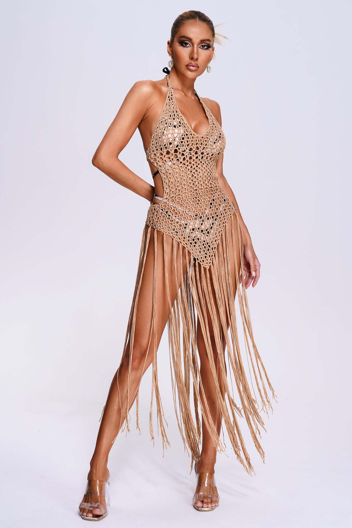 Tesare Püsküllü Dokuma Midi Elbise, plajdan bara uzanan her tür yaz davetinde şıklığınızla öne çıkmanızı sağlayacak. Bohem bir hava katan detaylı püskül dokuması, yazın ruhunu her anınıza taşır. Halter yaka ve açık sırt detayı ile bronzlaşmış teninizi ve favori bikininizi sergileme fırsatı sunar. Midi boyu ise zarif ve sofistike bir görünüm sağlar.