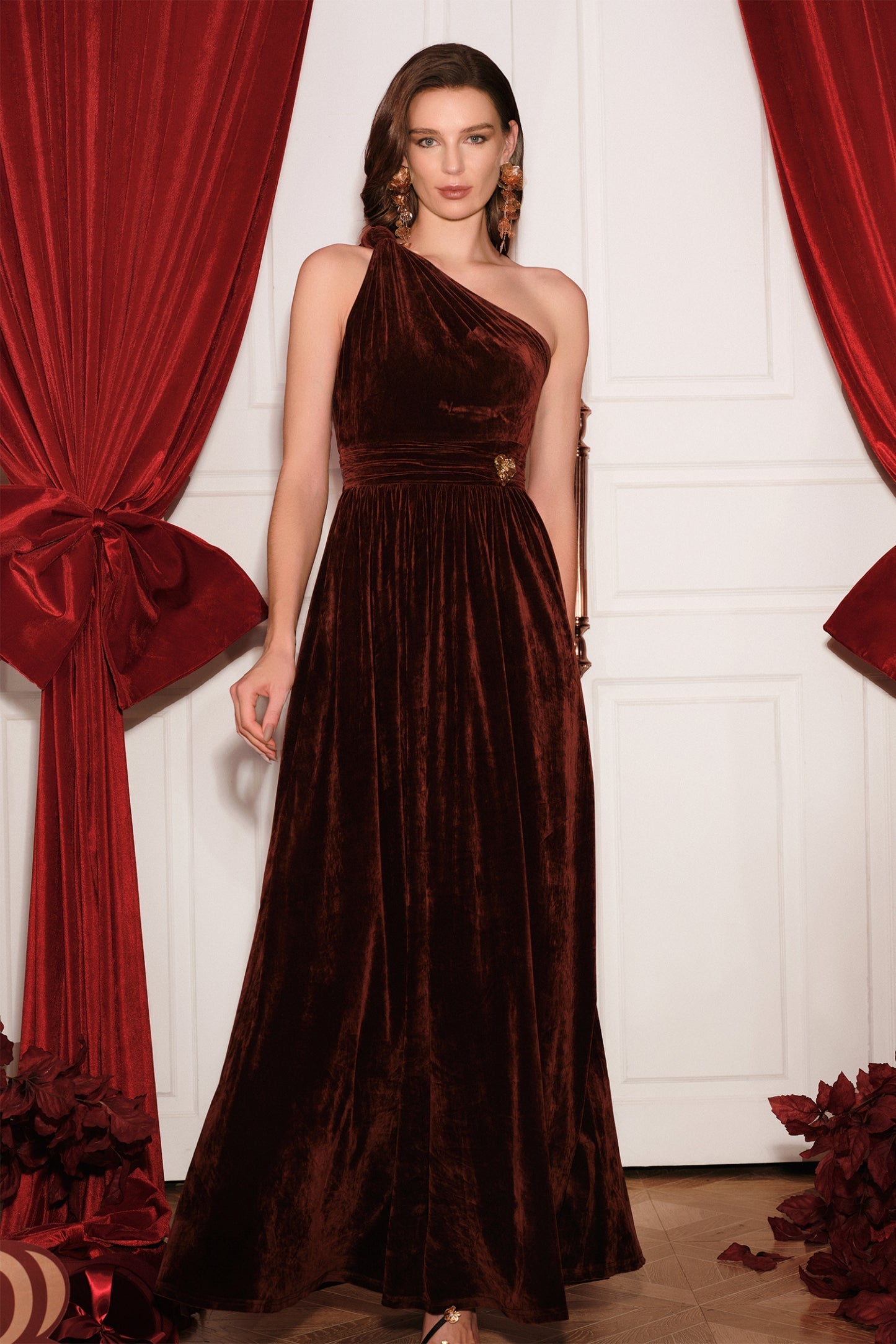Tessy Tek Omuz Maxi Elbise - Kahverengi tonlarının asaletini üzerinizde taşıyın. Göğüs, bel ve kalça bölgesindeki esnek yapısı sayesinde vücut hatlarınıza mükemmel bir uyum sağlar. Clara Fonet Atelier koleksiyonunun bir parçası olan bu elbise, özel tasarımlar, üstün kaliteli malzemeler ve usta işçiliği ile ön plana çıkar.
