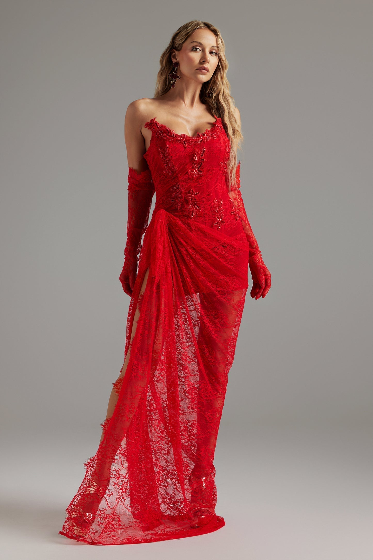 Ateşli ruhunuza hitap eden bu kırmızı, dantelli straplez maksi elbise ile zamansız zarafeti ve romantizmin etkileyici dokunuşunu bir arada keşfedin. Kusursuz bir siluet yaratan Thandiwe Dantelli Straplez Maksi Elbise, özel günler için ideal bir seçimdir. Delikat dantel detayı ve vücudu saran kalıbıyla bu elbise, her daim göz alıcı olmanızı sağlayacak. Altın rengi küpeler ve uyumlu topuklu ayakkabılarla birlikte stilinizi tamamlayın.