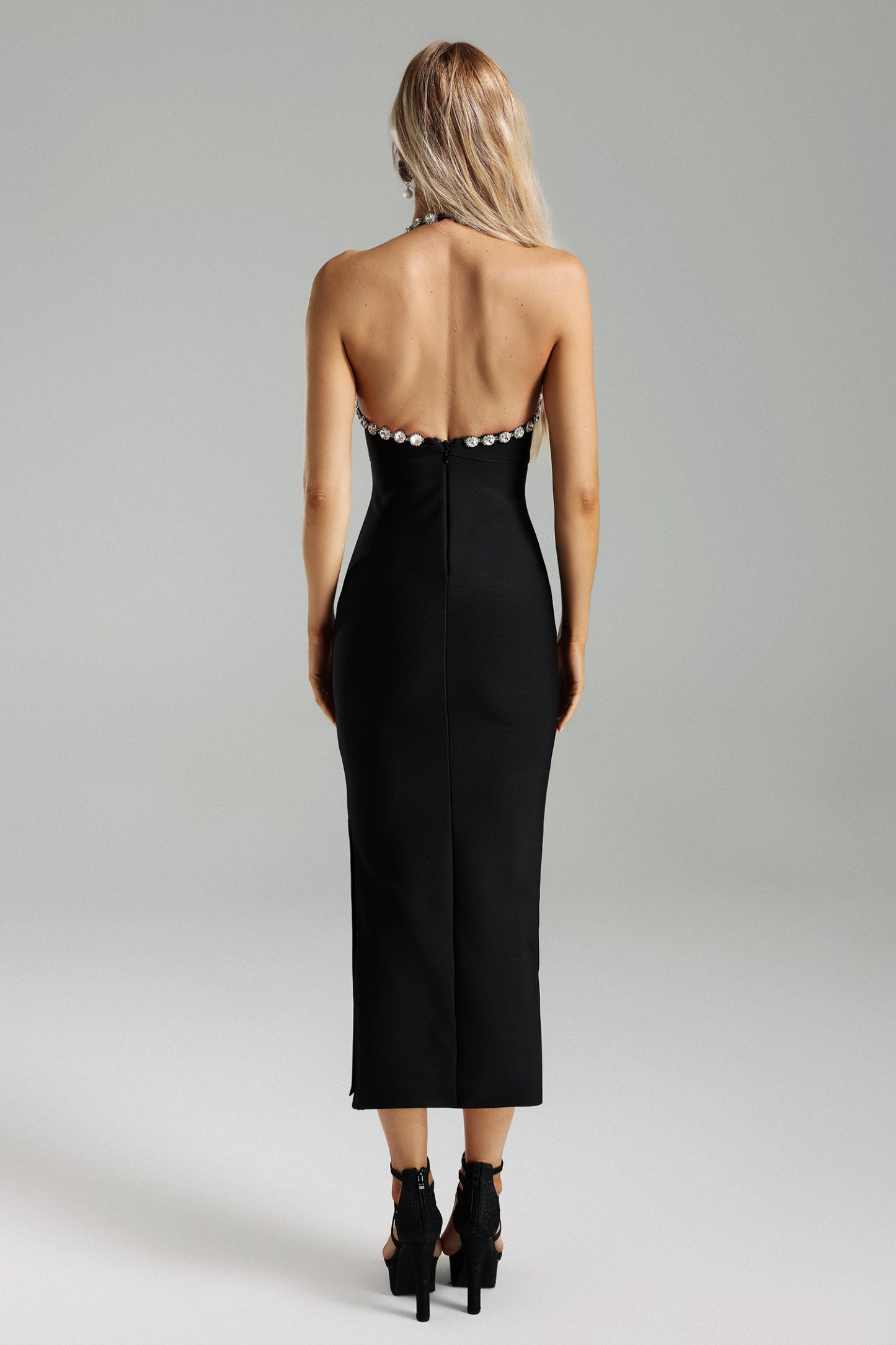 Taş Detaylı Halter Yaka Maksi Elbise, vücut hatlarınıza mükemmel uyum sağlayacak şekilde tasarlandı. Göğüs, bel ve kalça bölgelerinde yer alan esnek yapı, zarif bir duruş sergilemenizi sağlar. Bu özel tasarım elbise, ışıltılı taş detaylarıyla dikkat çekerken, halter yaka kesimi ile feminen bir görünüm sunar.