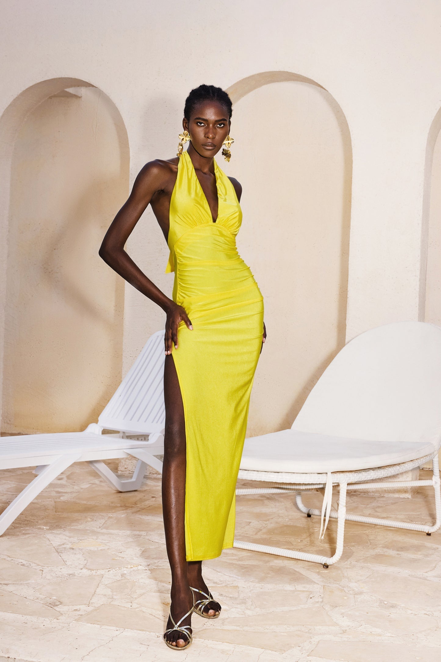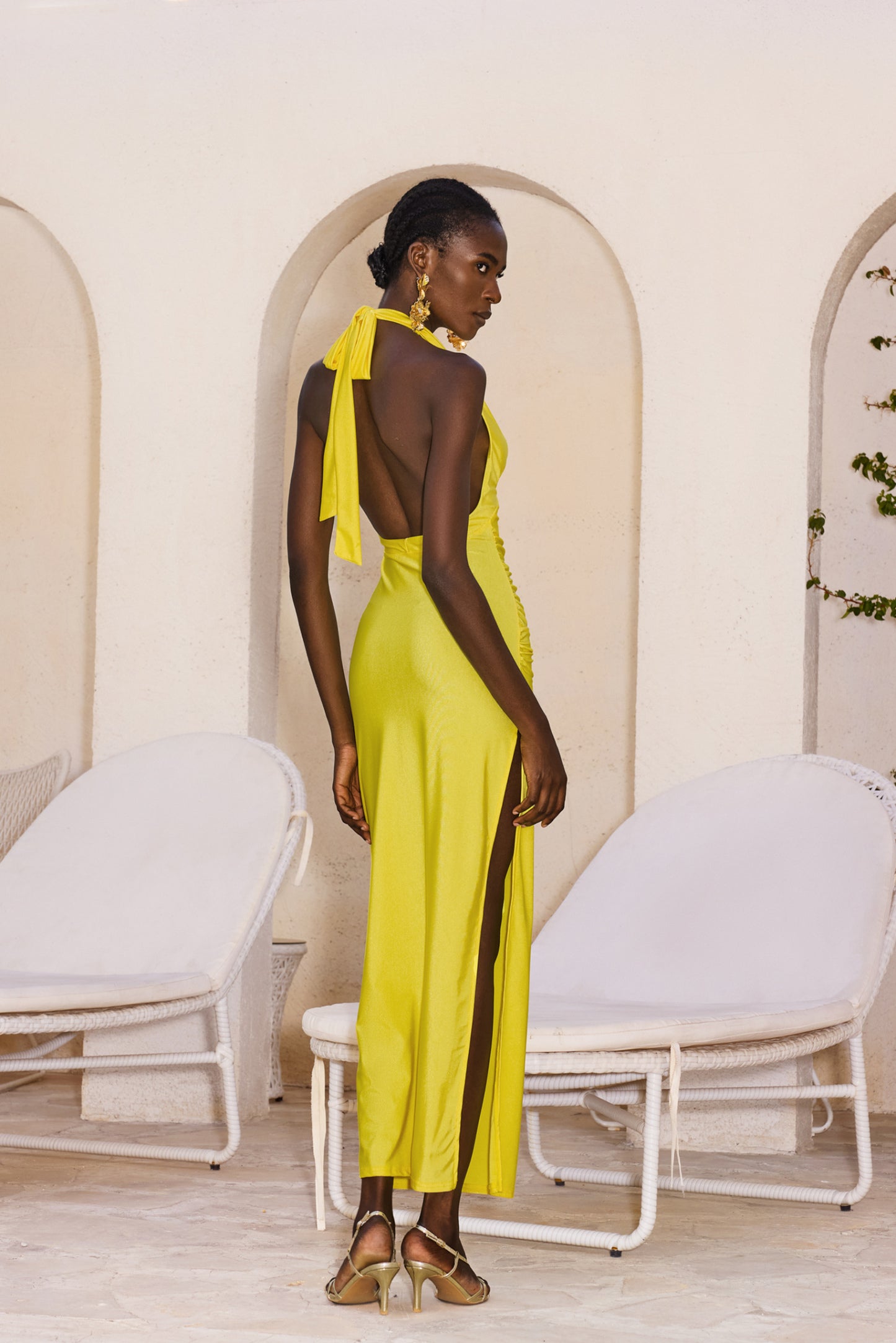 "Tiana" Halter Yaka V Kesim Kolsuz Uzun Elbise, gardırobunuzda özel bir yere sahip olacak. Ürün, çarpıcı V yaka kesimi ve zarif halter boyun tasarımı ile dikkat çekerken, özel üretim kumaşı sayesinde tüm gece rahatlık sunar. Vücudu kusursuz şekilde sararak zarif bir siluet çizen bu elbise, yumuşak ve esnek kumaşı ile hareket özgürlüğü sağlar.