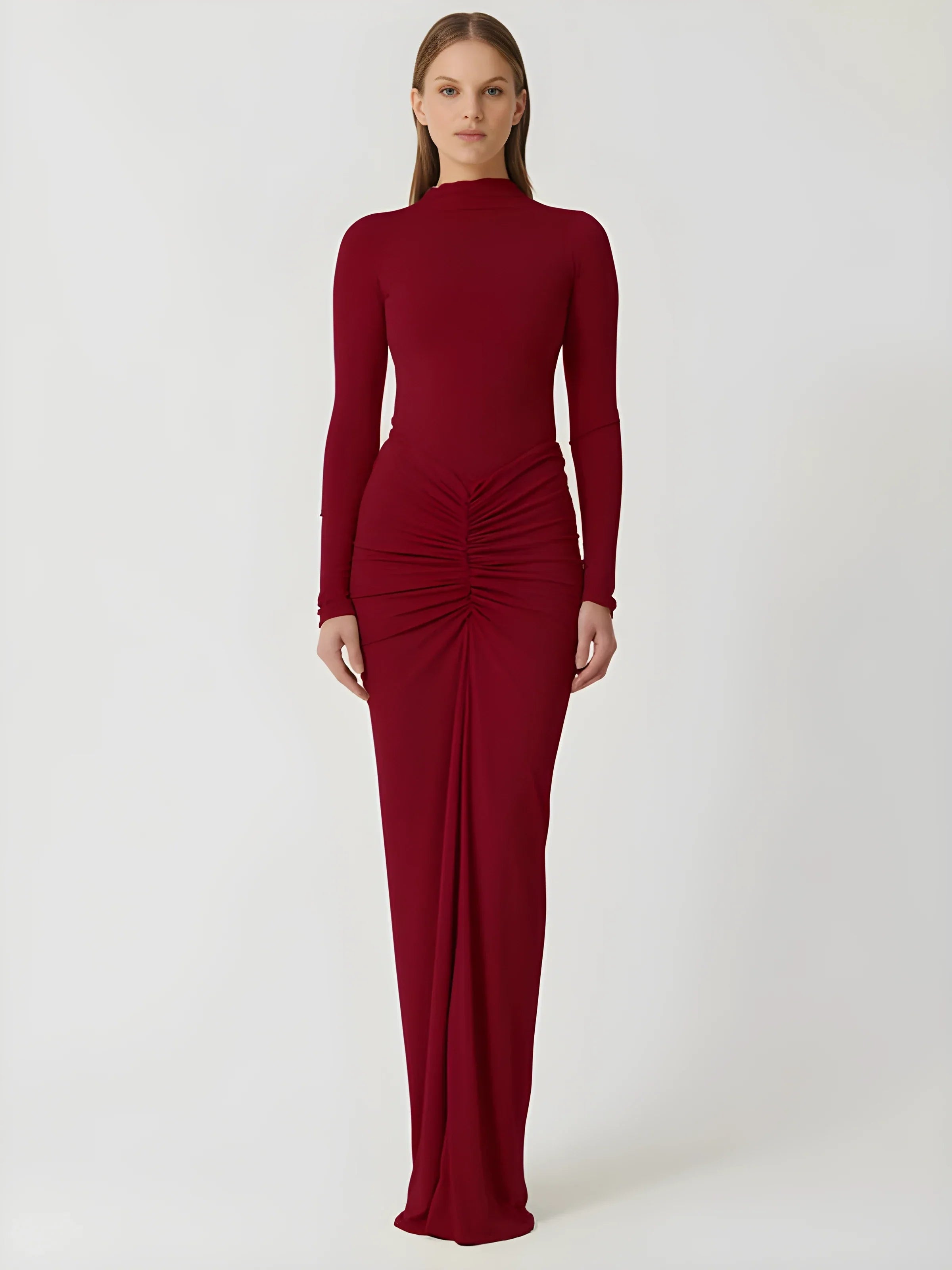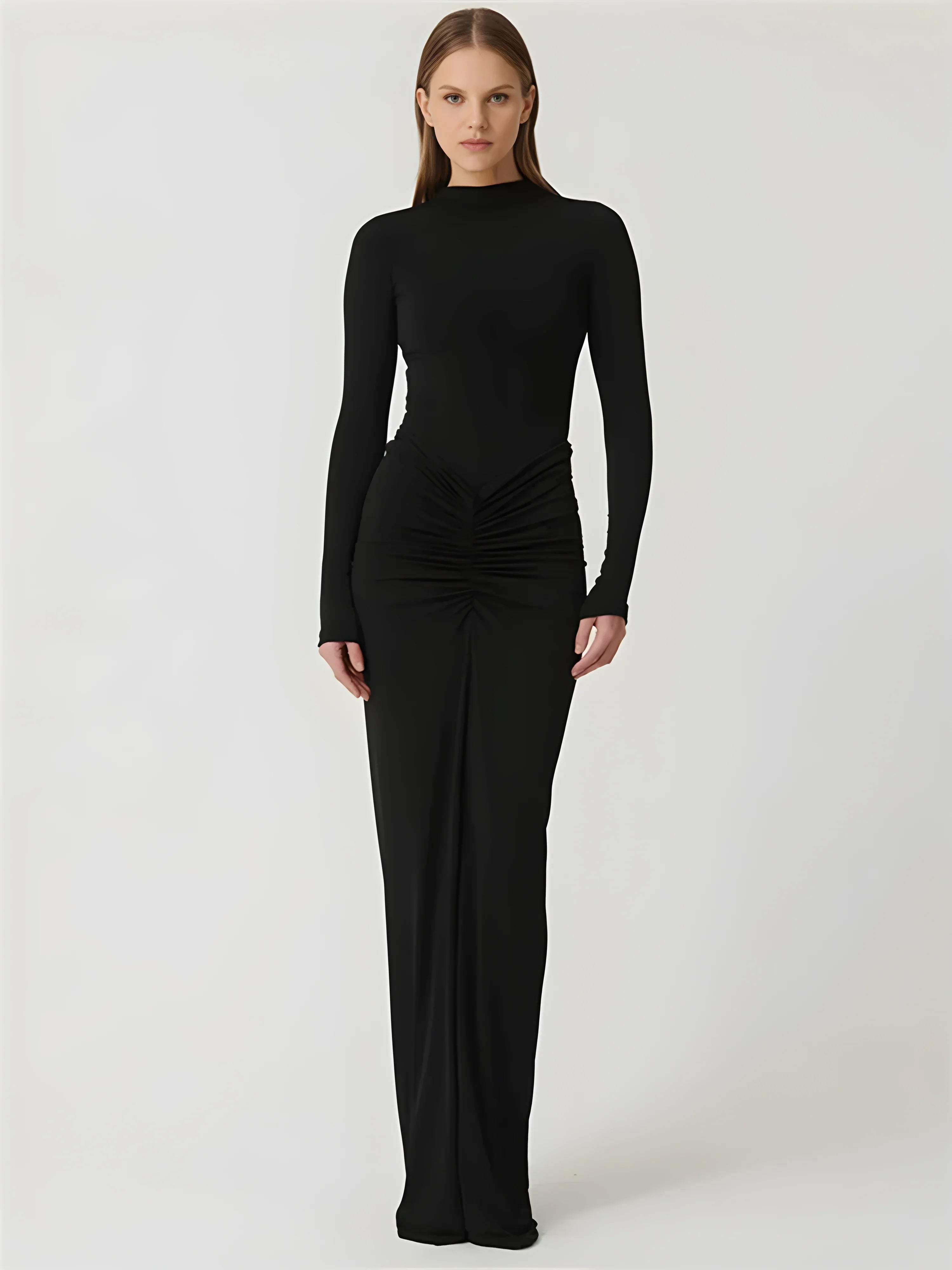 Uzun kollu, bisiklet yaka, merkezden aşağı doğru inen büzgü detayı ile figürü vurgulayan yapıda tasarlanmış, yere kadar uzanan düz kesim elbise.