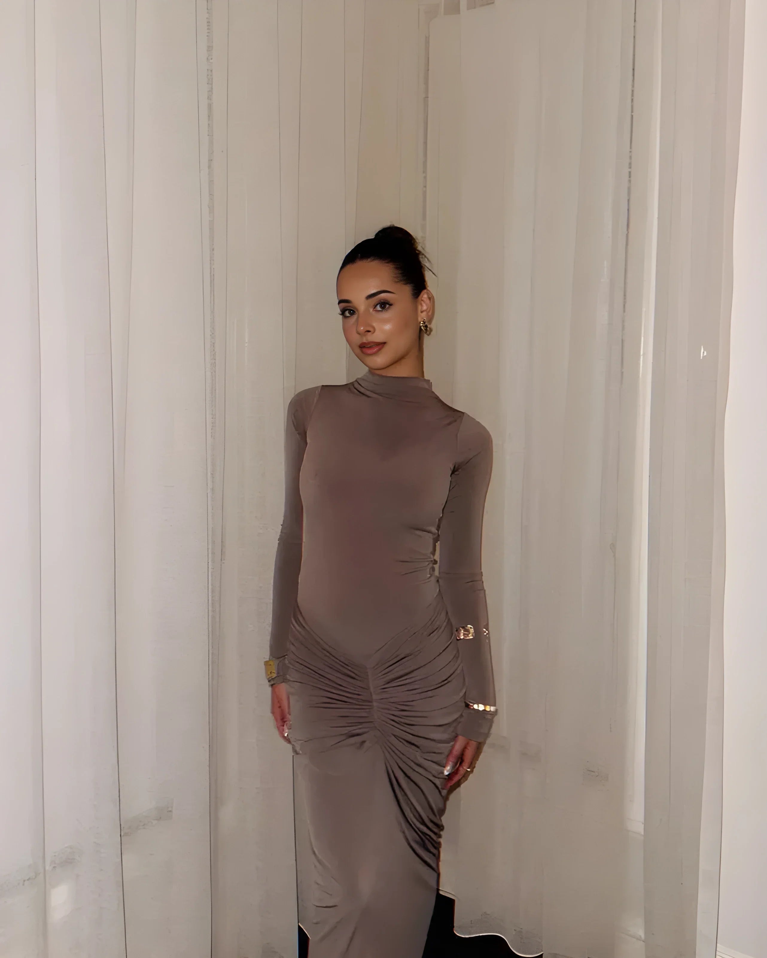 Detay: Karın ve kalça hattında toplayıcı büzgü çizgisi; sade ama güçlü bir siluet etkisi.