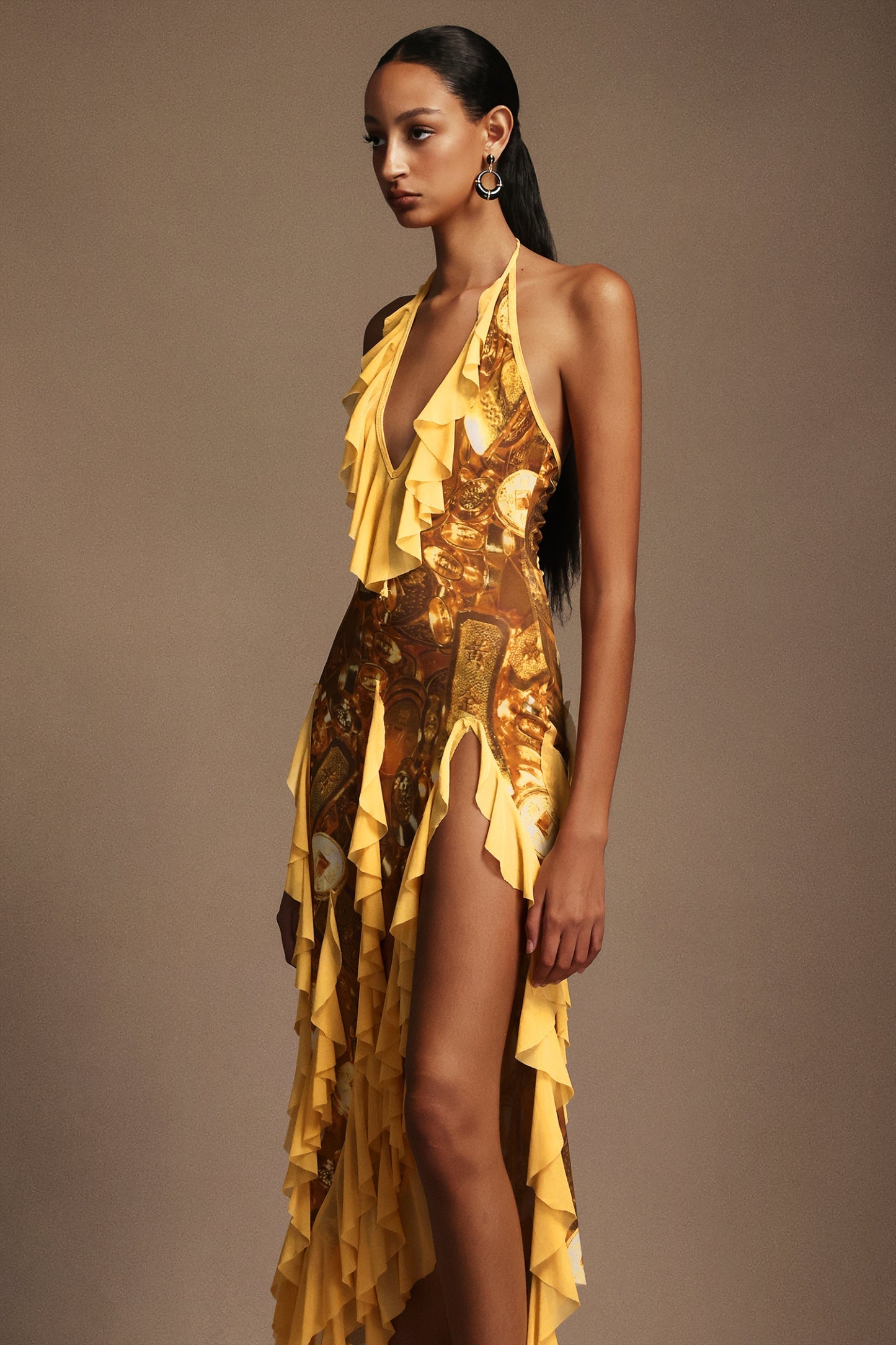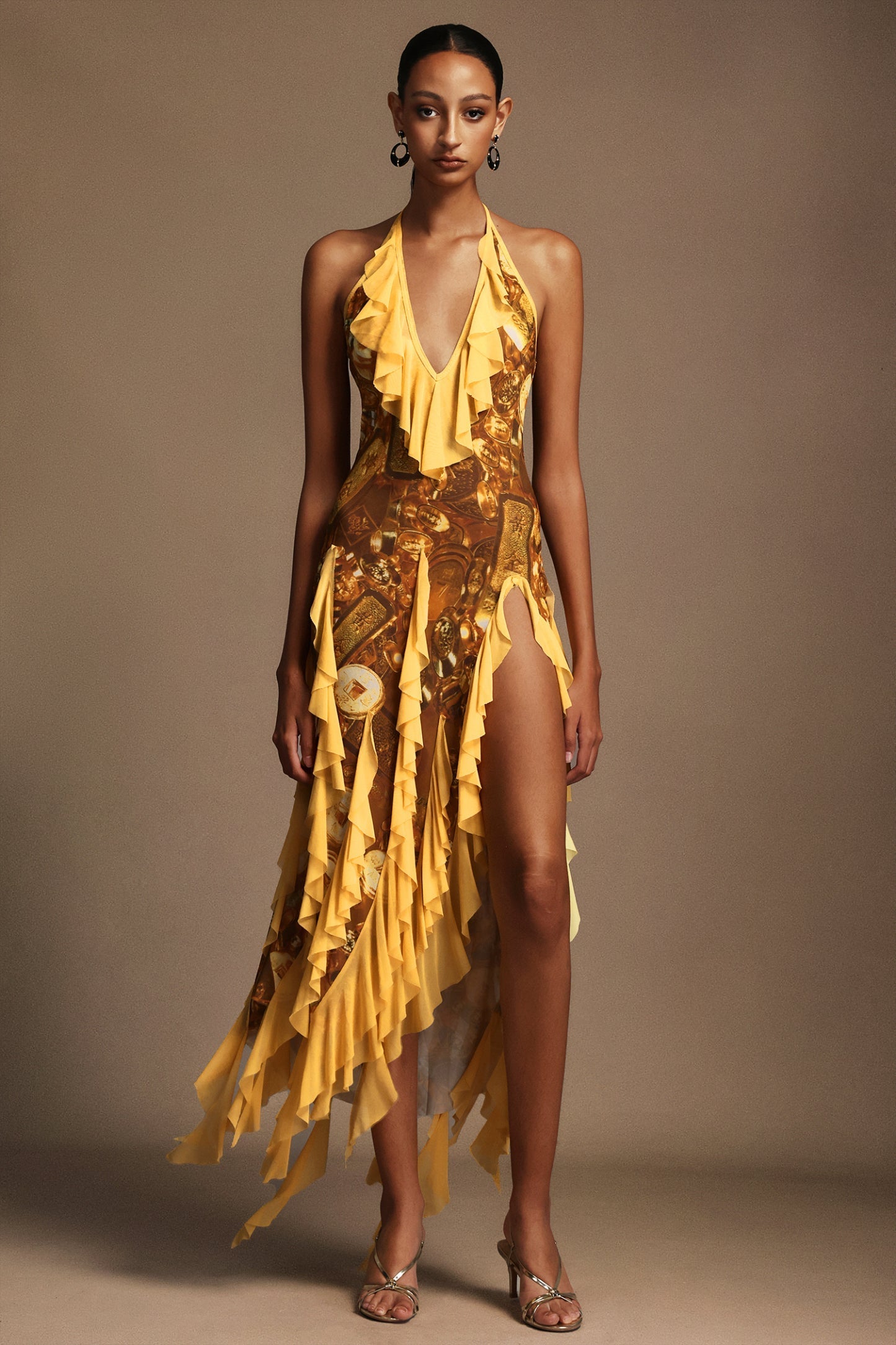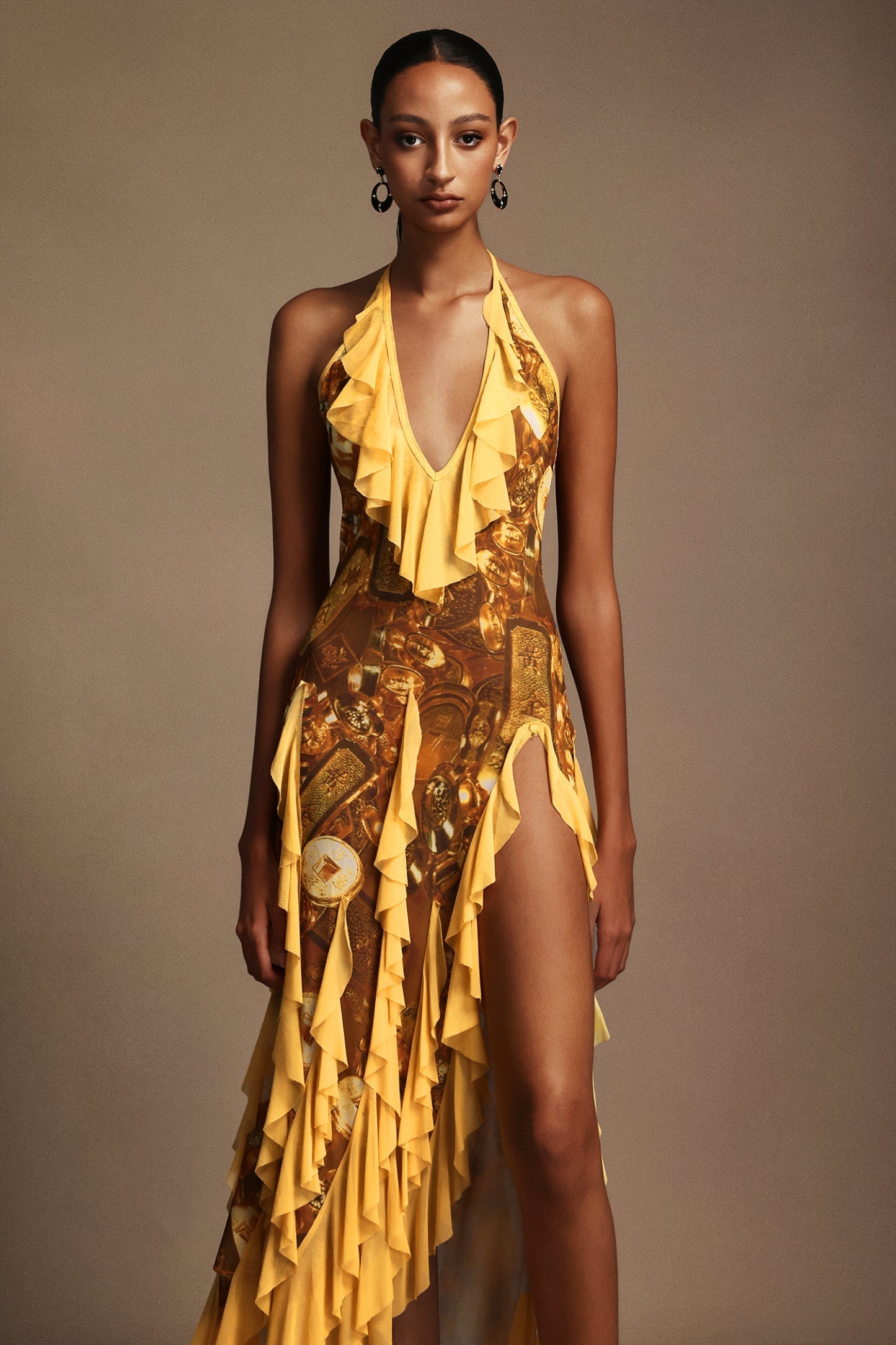 Uri Halter Yaka Kolsuz Volanlı Maxi Elbise, özgün tasarımı ile her durumda göz alıcı bir görünüm sunar. Bu elbise, uzun ve akıcı yapısıyla zarafeti simgelerken, halter yaka ve volan detayları ile modern bir dokunuş katıyor. Kumaşın esnek yapısı sayesinde gün boyu rahat bir kullanım sağlar. Özel üretim olan bu parça, davetlerde, özel gece etkinliklerinde veya yaz akşamlarında plajda şıklığınızı korumanız için ideal.