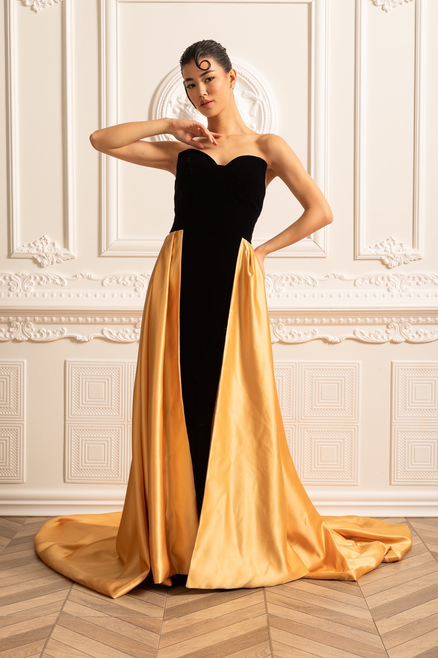 Vücuda Oturan Siyah Kadife Üst ve Akışkan Altın Saten Etekli Abiye Elbise