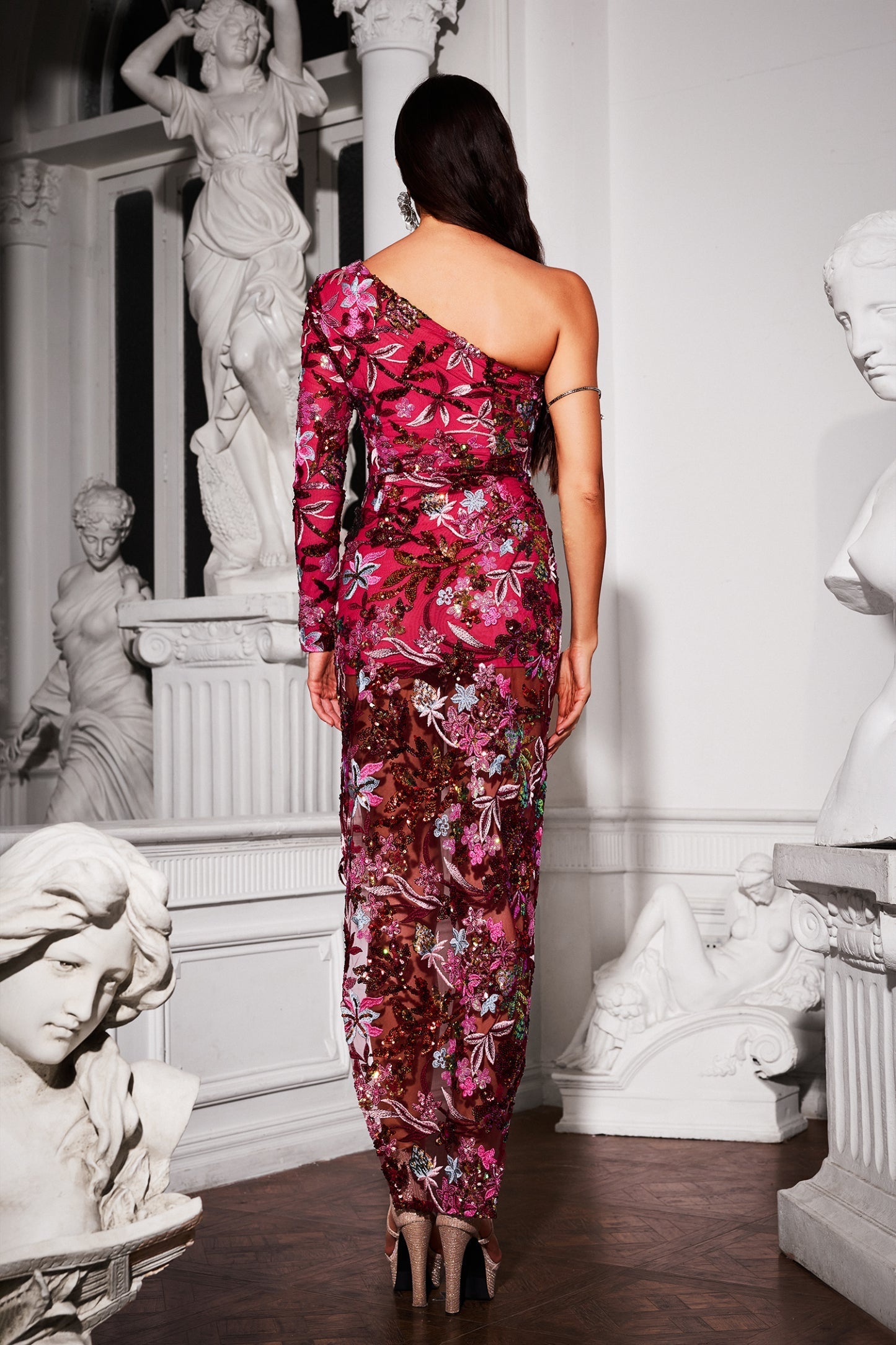 Pembe Tek Omuzlu Çiçek İşlemeli Elbise, her özel gününüzde ışıltınızı yansıtacak. Bu büyüleyici tasarım, incelikle işlenmiş çiçek motifli pullar ve zarif tül detayları ile donatılmıştır. Şık tek omuz silüeti, figürünüzü mükemmel şekilde sarar ve sofistike bir dokunuş katarken, asimetrik kesimiyle modern bir görünüm sunar. Elbiseniz, ince yapılı topuklu ayakkabılar ve ışıltılı bir çanta ile kombine edildiğinde tarzınızı bir üst seviyeye taşıyacak.