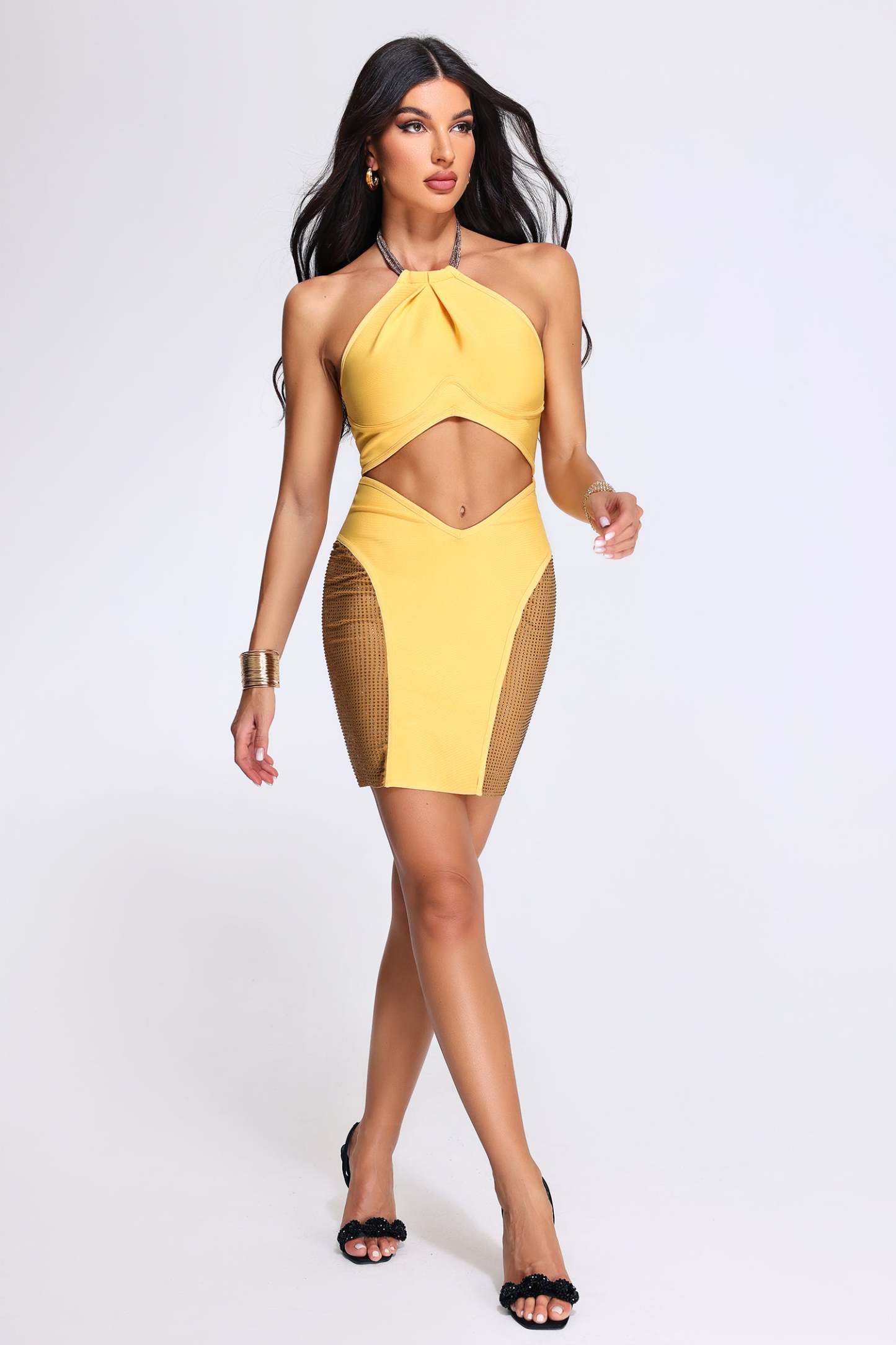 Walterine kesimli halter yaka ile feminen güzelliğinizi ön plana çıkarın. Bu bandaj elbise, %97 polyester ve %3 spandex içeren esnek yapısı ile vücudu kusursuz bir şekilde sararak zarif bir siluet çizer. El yıkama veya kuru temizleme yöntemleriyle bakımını yapabilirsiniz.