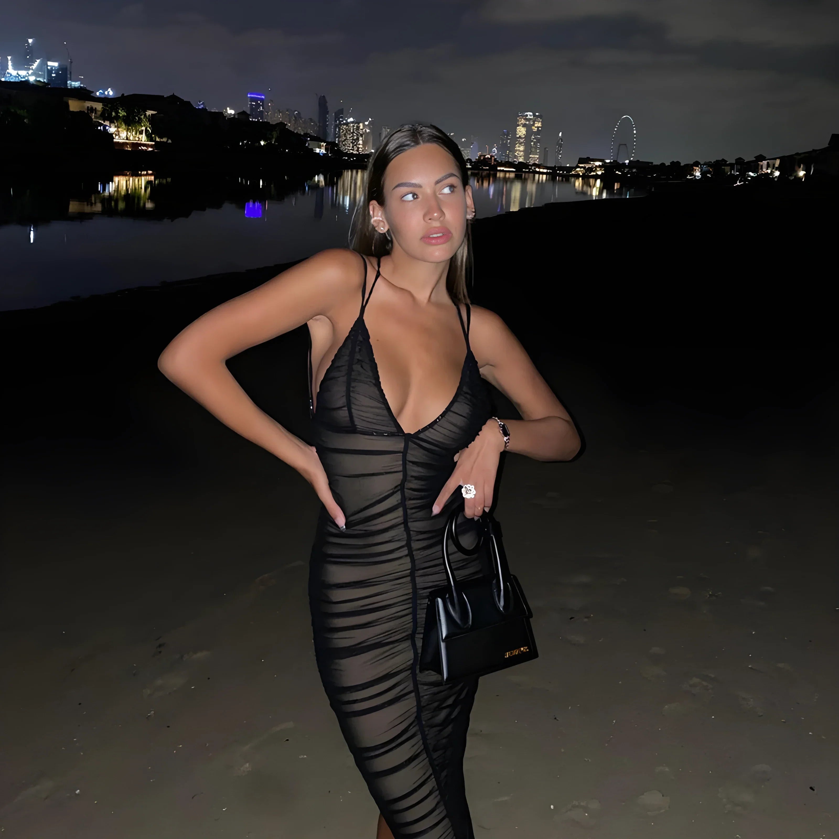 İnce askılı, derin V yaka, vücuda oturan transparan detaylı midi elbise. Plaj geceleri ve tatil stiline özel çarpıcı bir görünüm sunar.