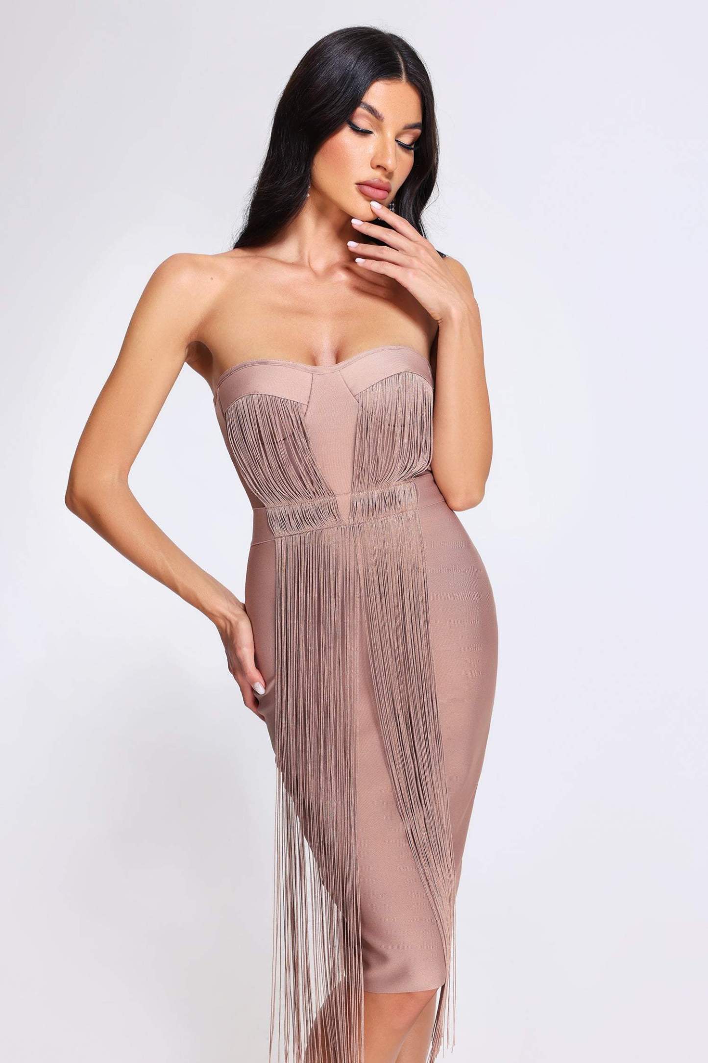 Xiamara Püsküllü Bandaj Midi Elbise, büyüleyici tasarımı ve kaliteli kumaş yapısı ile dikkat çeken bir seçenektir. %92 polyester ve %8 spandex karışımından oluşan esnek kuması, günün her anında rahatlık sağlar ve vücut hatlarınıza mükemmel uyum sağlar. Özel üretim olan bu elbise, elde yıkanmalıdır.