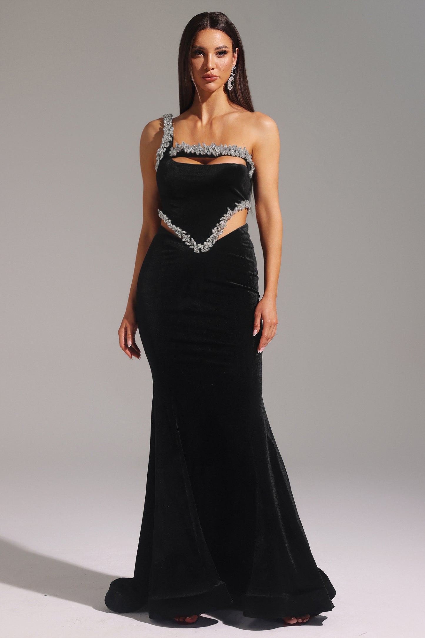 Yedda Tek Omuz Elmas İşlemeli Uzun Elbise