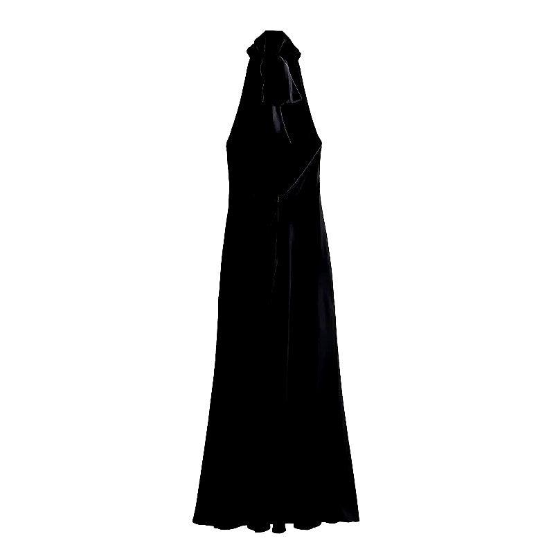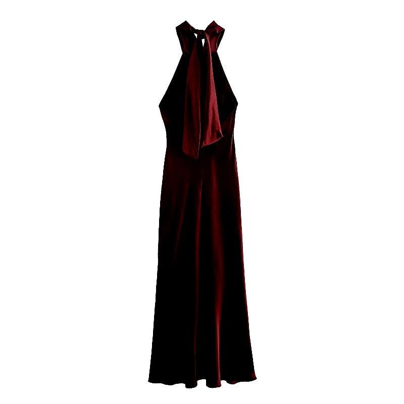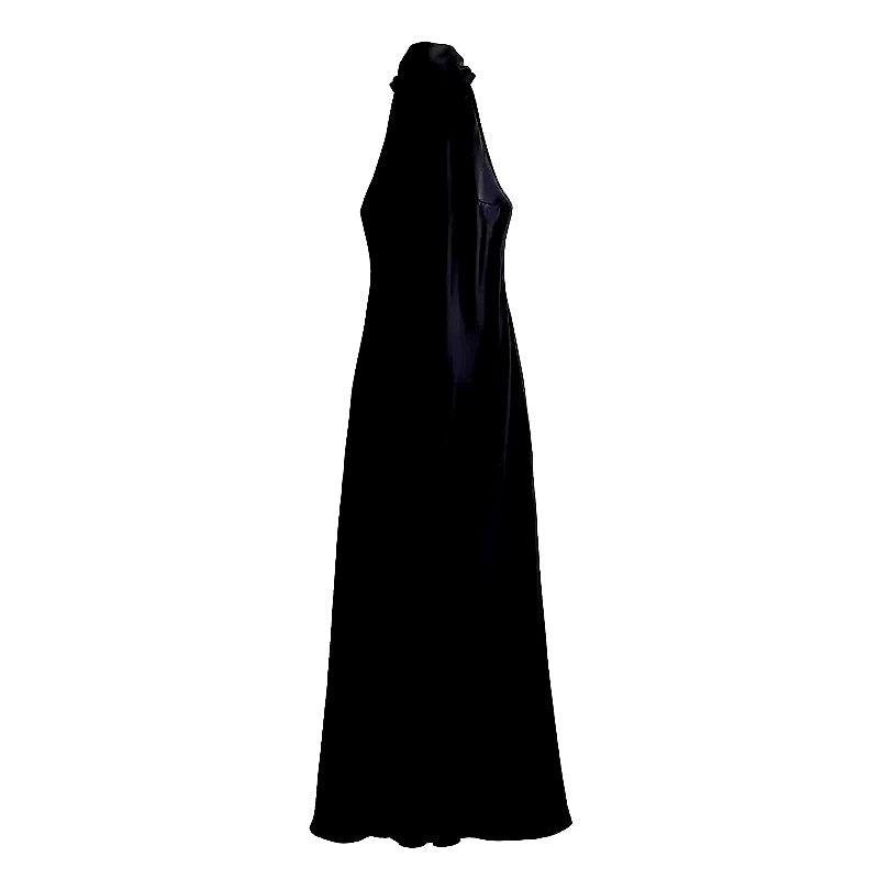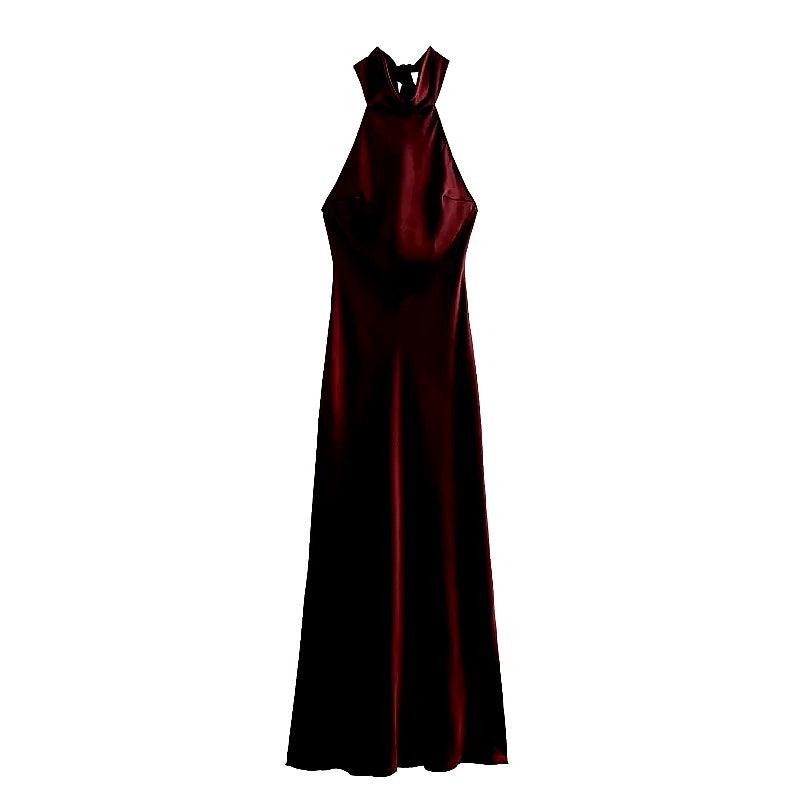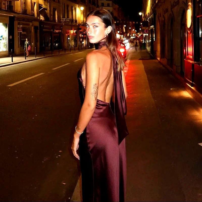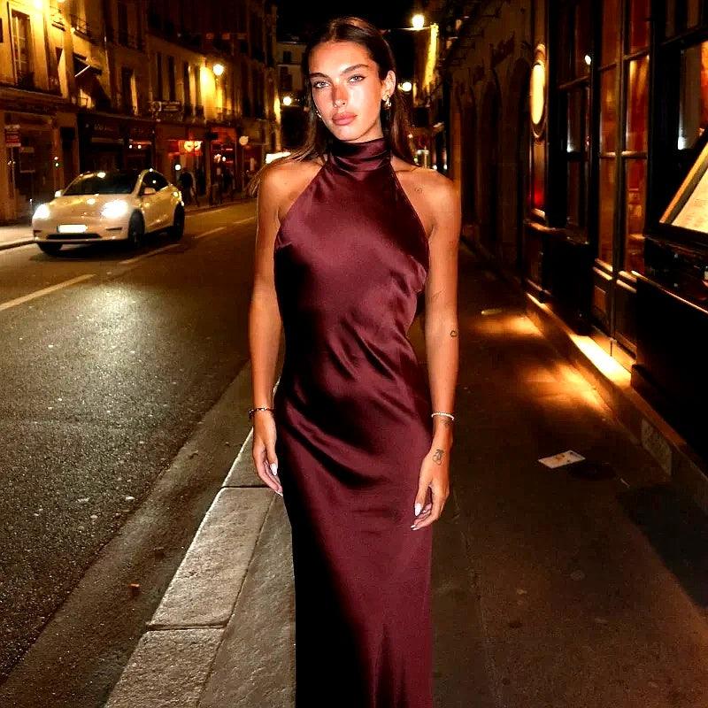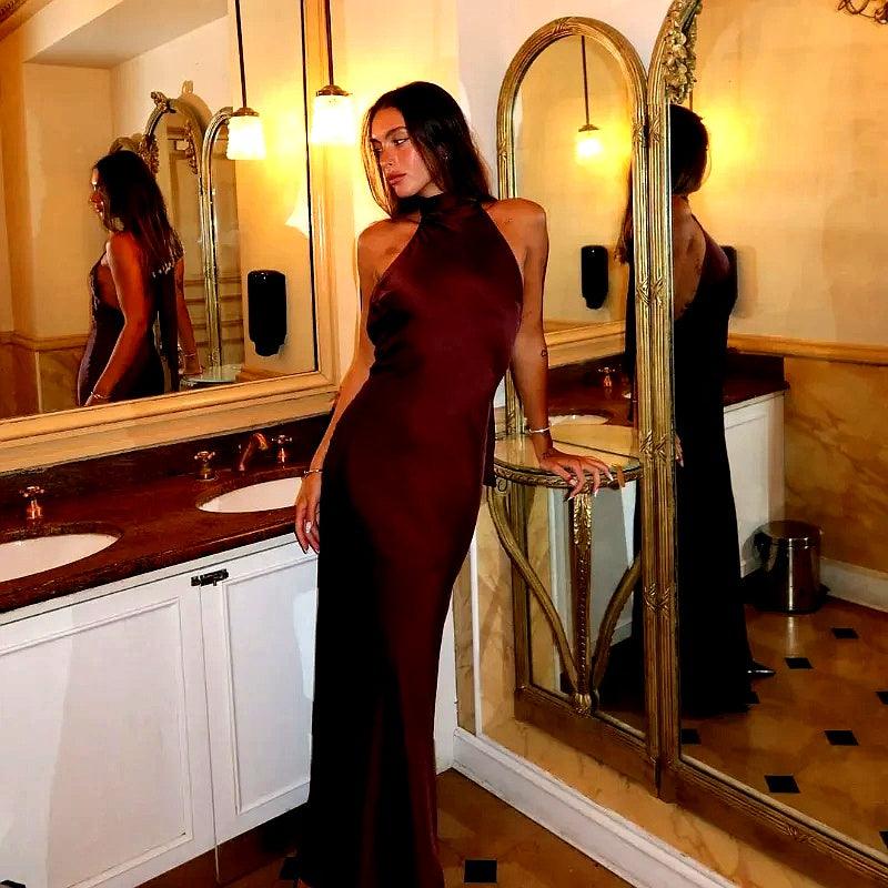 Sırt dekolteli şık bir tasarıma ve zengin, lüks bir renk tonuna sahip bu çarpıcı halter yakalı saten maksi elbise ile bir açıklama yapın. Akşam etkinlikleri, partiler veya göz alıcı bir gece için mükemmel olan bu elbise, zarafet ve sofistike bir görünüm sergiler. Zamansız, baş döndürücü bir görünüm için minimal takılar ve topuklu ayakkabılarla kombinleyin.