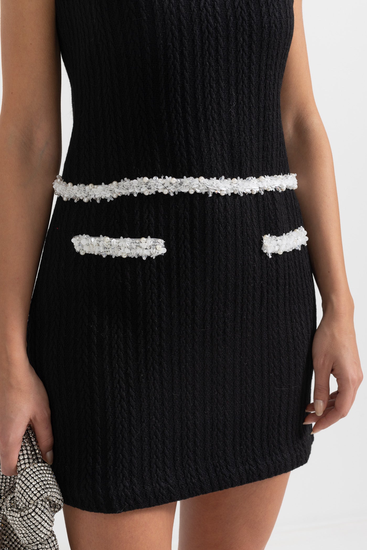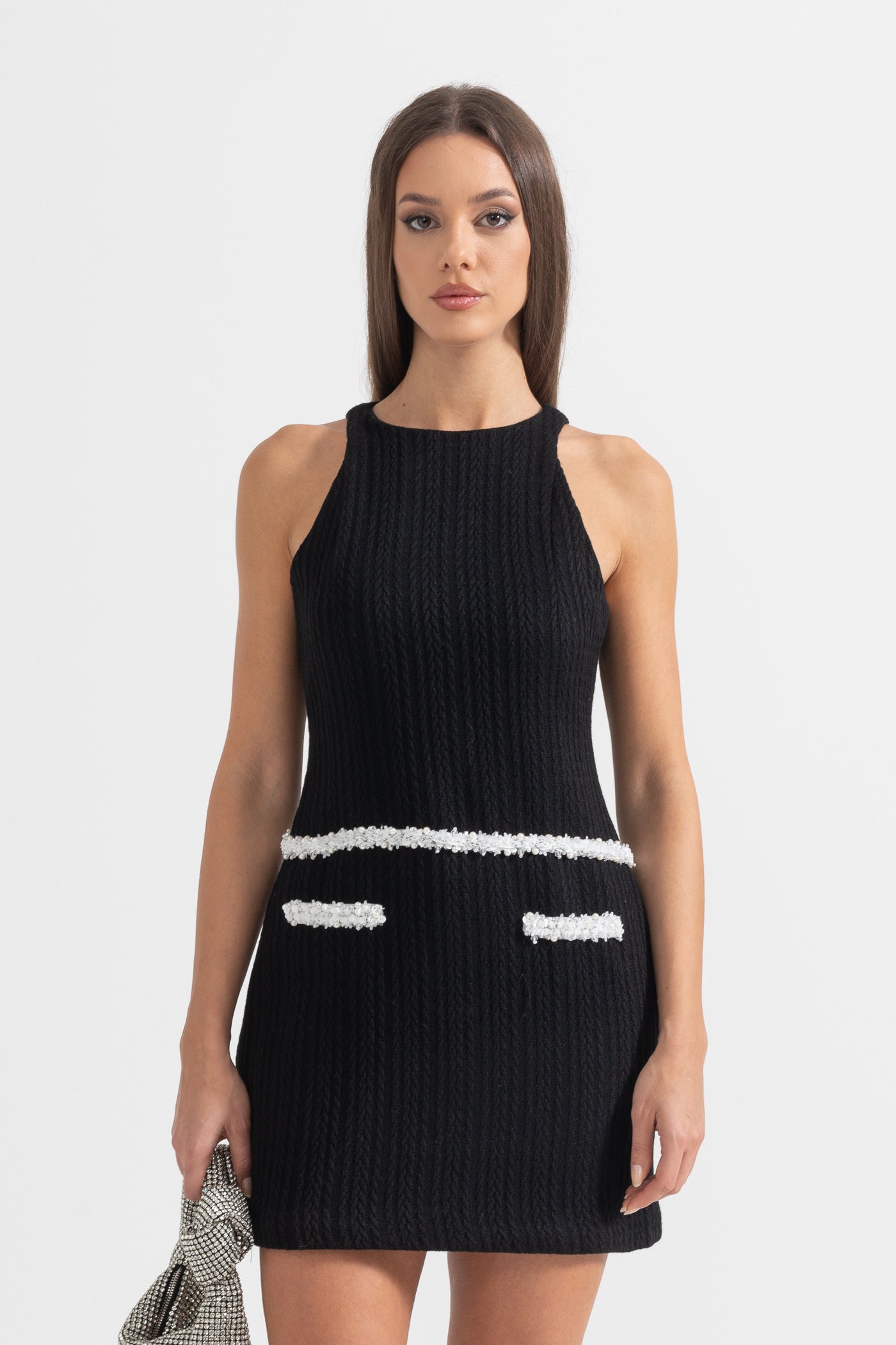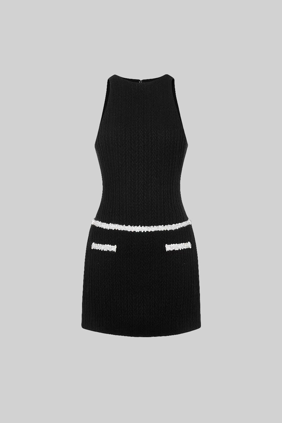 Zamansız şıklığıyla öne çıkan Siyah Kolsuz Dokulu Mini Elbise, vücuda oturan kesimi ve kontrast beyaz bel detayıyla sofistike bir duruş sunuyor. Modern tasarımı, işlevsel ön ceplerle tamamlanarak hem şık hem de pratik bir stil yaratıyor.