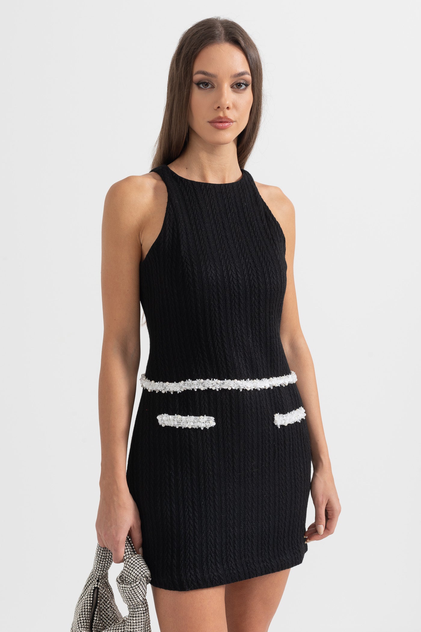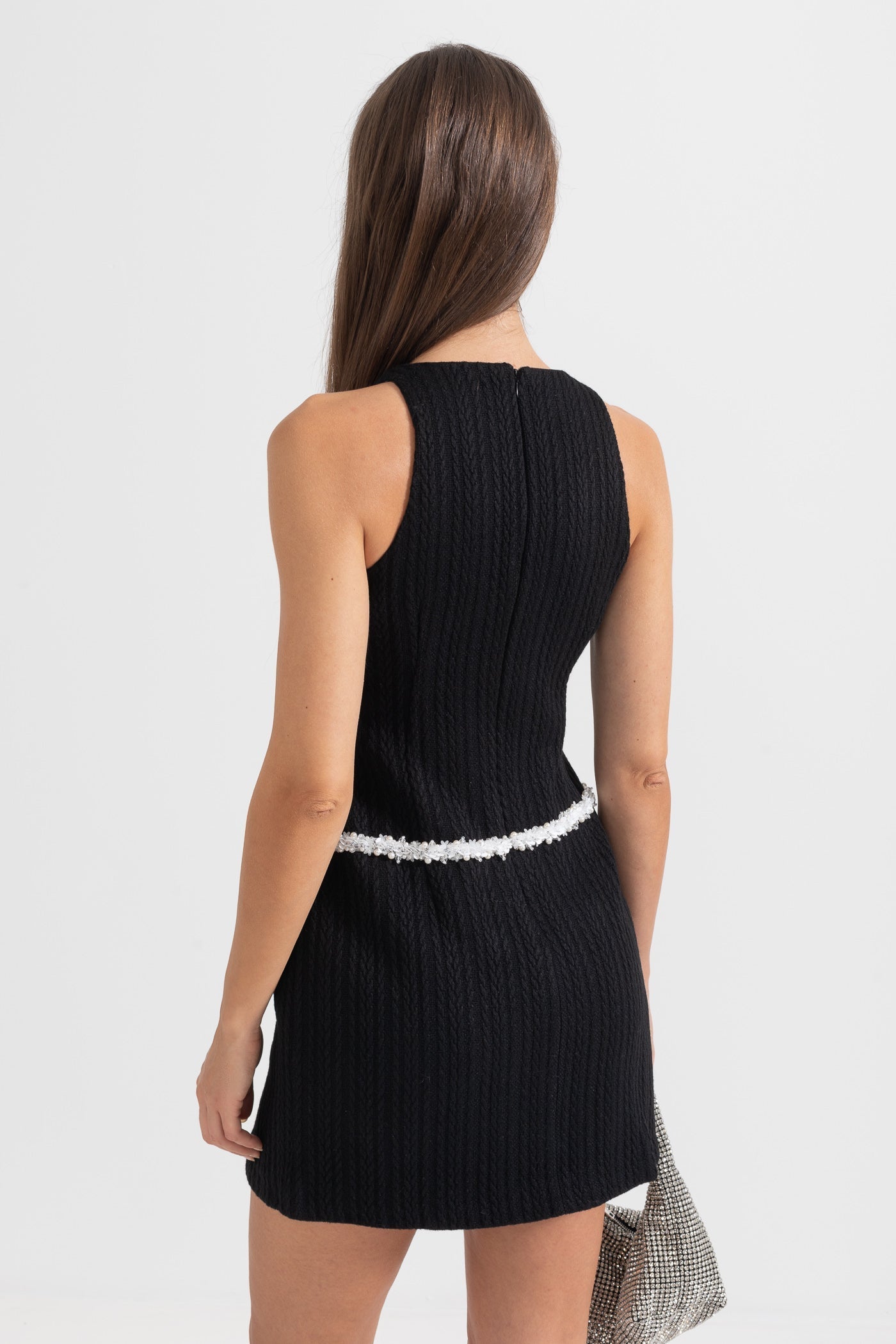 Siyah Şık Kolsuz Dokulu Mini Elbise